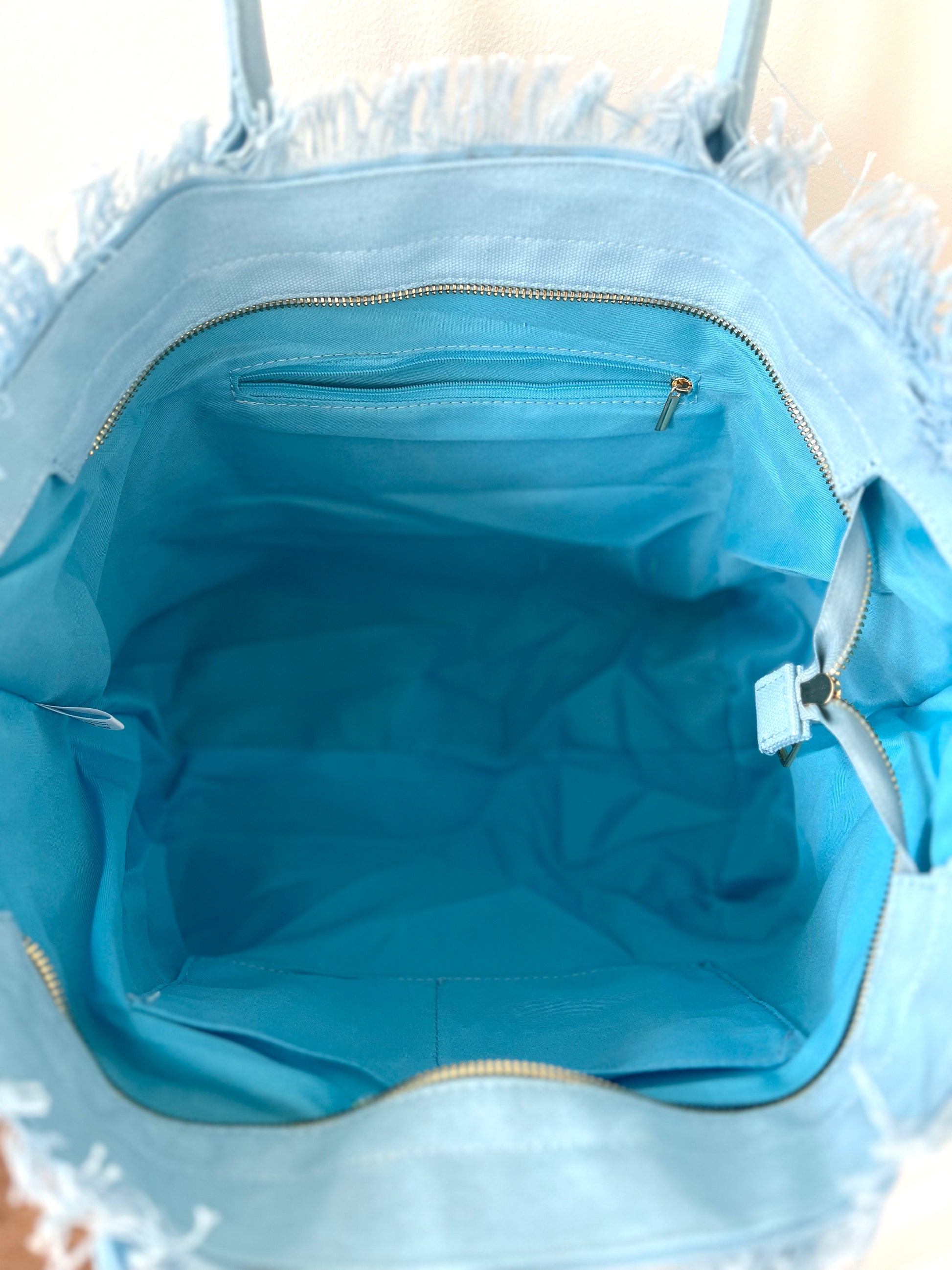 Fringe with benefits! The tote is taking summer by storm. Featured in 2 cheerfully chic colors. Top zipper closure to keep everything inside secure. Also features interior pockets.