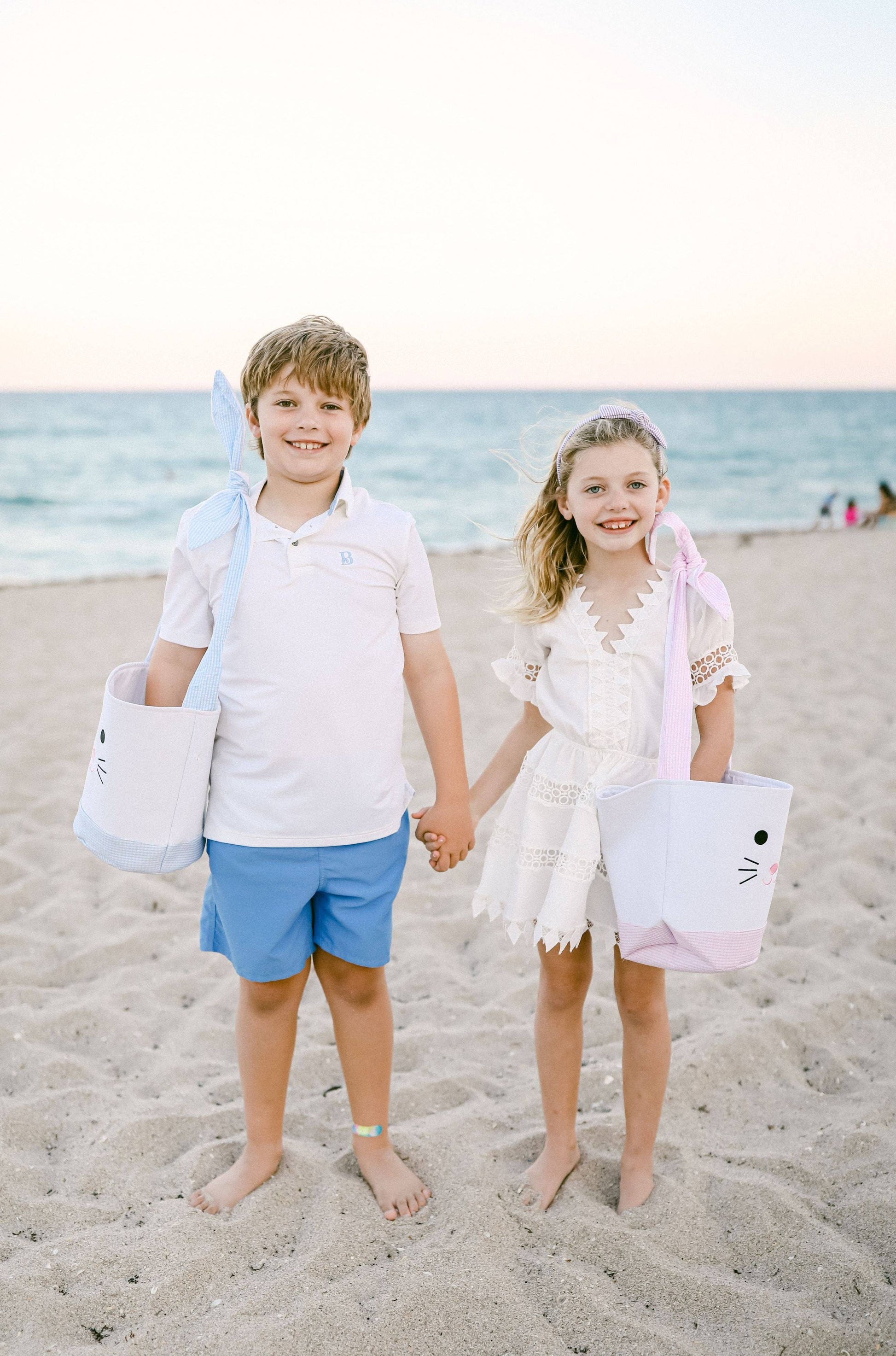 Celebrate the magic of springtime with a seersucker-trimmed Bunny Basket made for egg-hunting, Sunday morning surprises, and all of the excitement that the holiday has in store. With bunny ear straps and sweet bunny face embroidery, these large cotton totes are constructed of soft stone canvas and pastel seersucker and can be customized with a name or monogram for that extra special added detail. -Cotton Canvas and Seersucker -7.5" x 10.75" x 15.75"