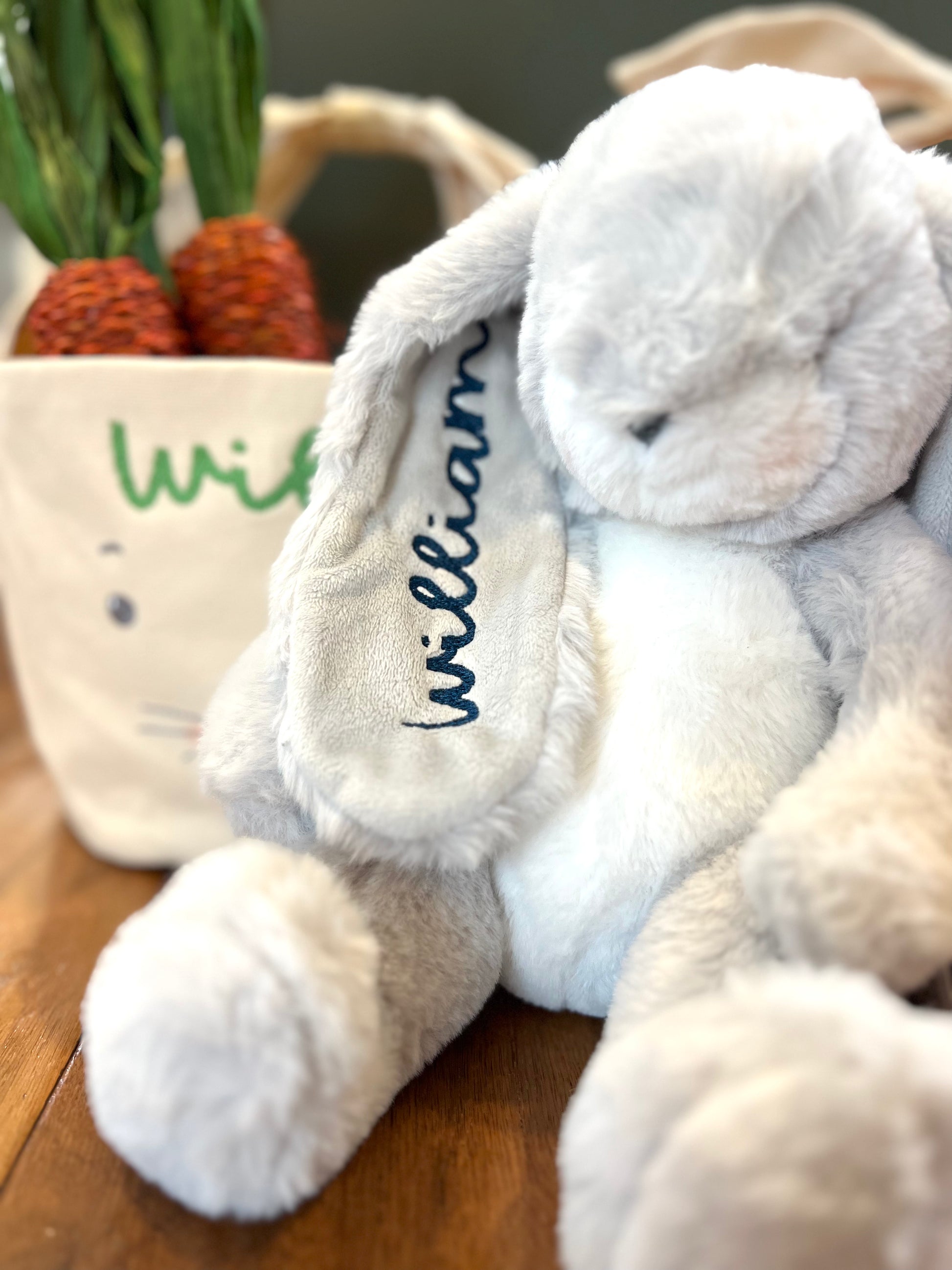 Little Nibble loves BIG hugs. With long lop buttery soft ears for soothing and hand-embroidered face, pink cheeks and big fluffy tail this stuffed bunny is made to be loved. This stuffed animal has cream and warm white fur and velour lined ears perfect for personalizing. This is sure to be a favorite stuffed bunny for wee ones and adults alike with its heirloom quality and timeless appeal. Features: 12” (30cm) tall, measured from head to outstretched toe