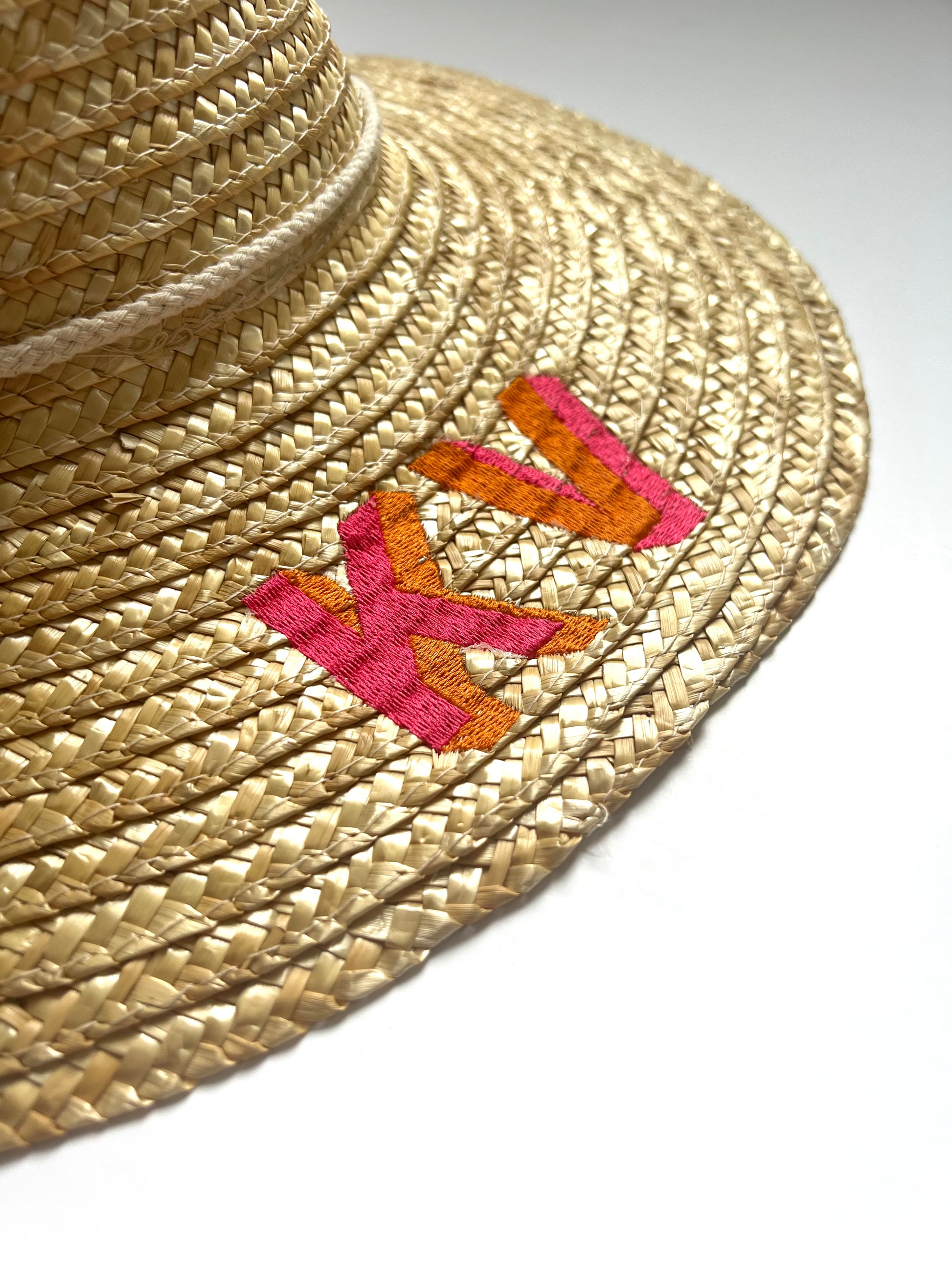 Here she is! We've waited all summer for this little number and it was worth. the. wait. This brim is slightly smaller than our ribbon sun hat. This sun hat also features an inner elastic sweatband and adjustable chin straps. The interior head fits an adult head size of about 55 cm- 59 cm. It is an easy fit and the chin strap is helpful with those windy beach days.