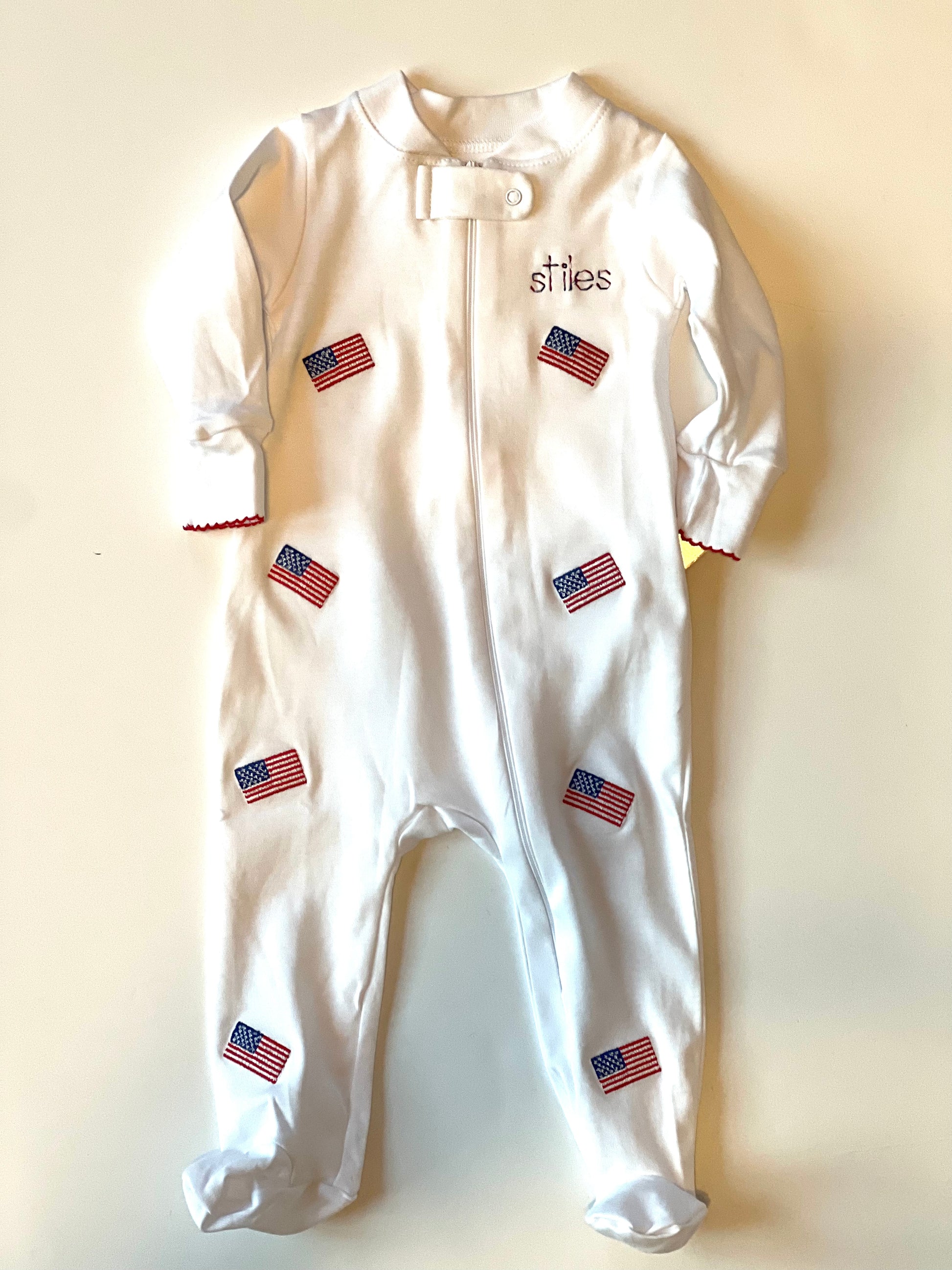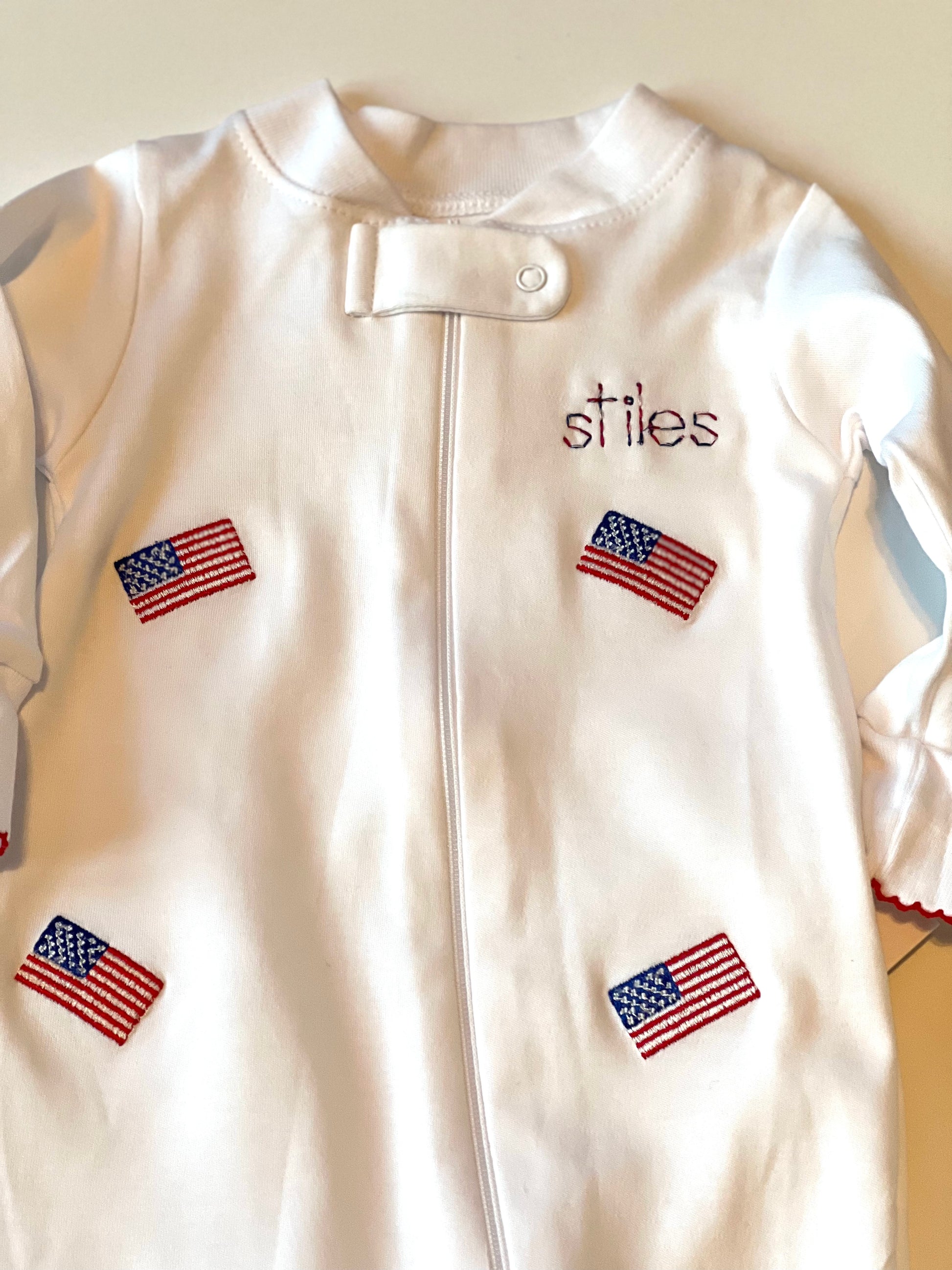 Details are everything in this adorable zipper sleeper. Embroidered American flags adorn this easy to zip (read: NO BUTTONS :)) sleeper. Built-in mittens to prevent scratching.