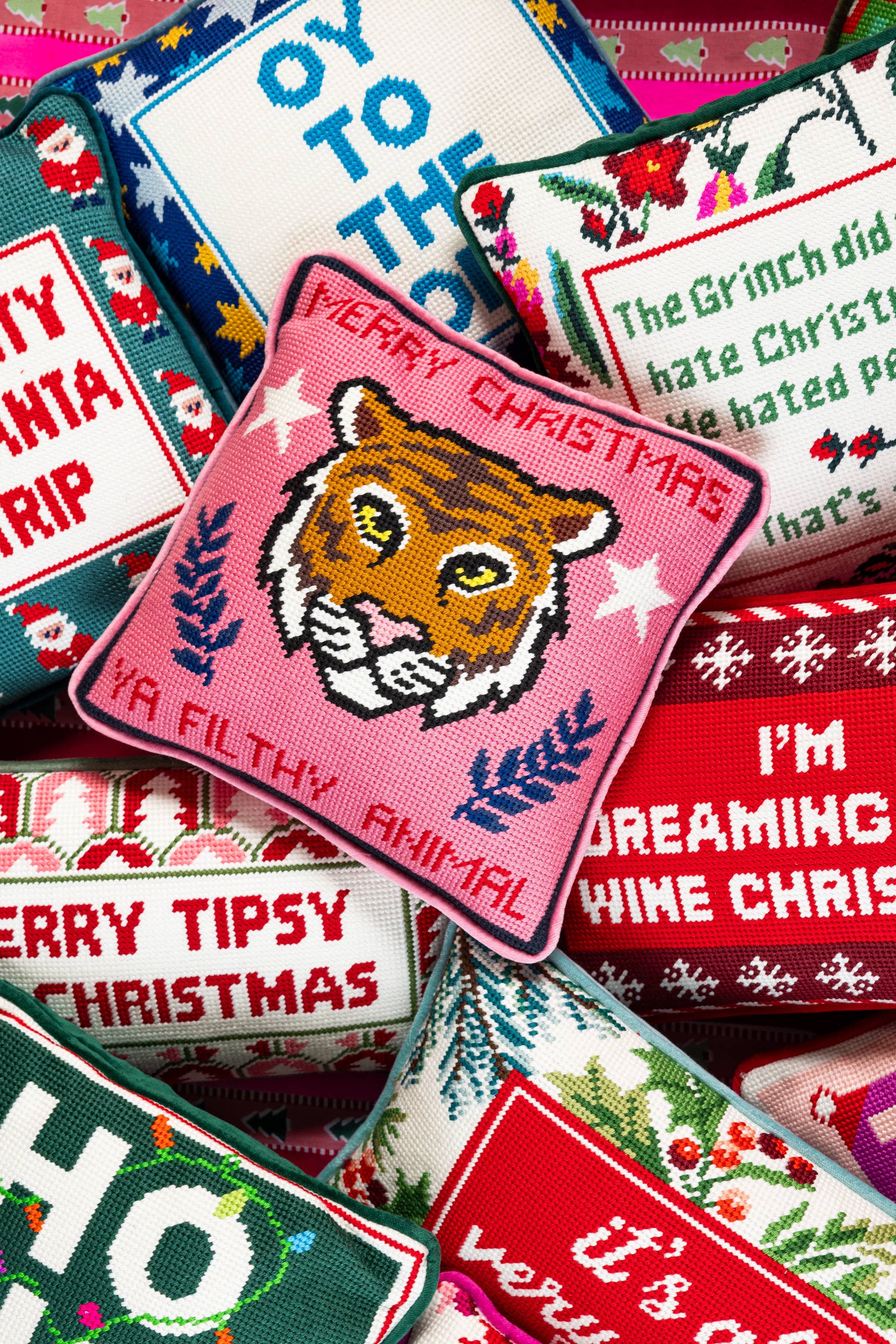 Whether you're naughty or nice, this cheeky needlepoint will make the season bright. Make a statement with this charming-meets-chic needlepoint pillow. Embroidered and backed in luxe pink velvet, we've revived this Southern staple with sayings that are sure to get a smile. They are guaranteed to spark joy and make the perfect gift! Measures 10" x 10" - Small pillow, big statement! Dare to mix with our scalloped linen, contrast trim velvet, ruffled block print, and needlepoint pillows for an insta-worthy pillow pile. 10" x 10" -Front: 100% Wool -Back: 100% Cotton Velvet
