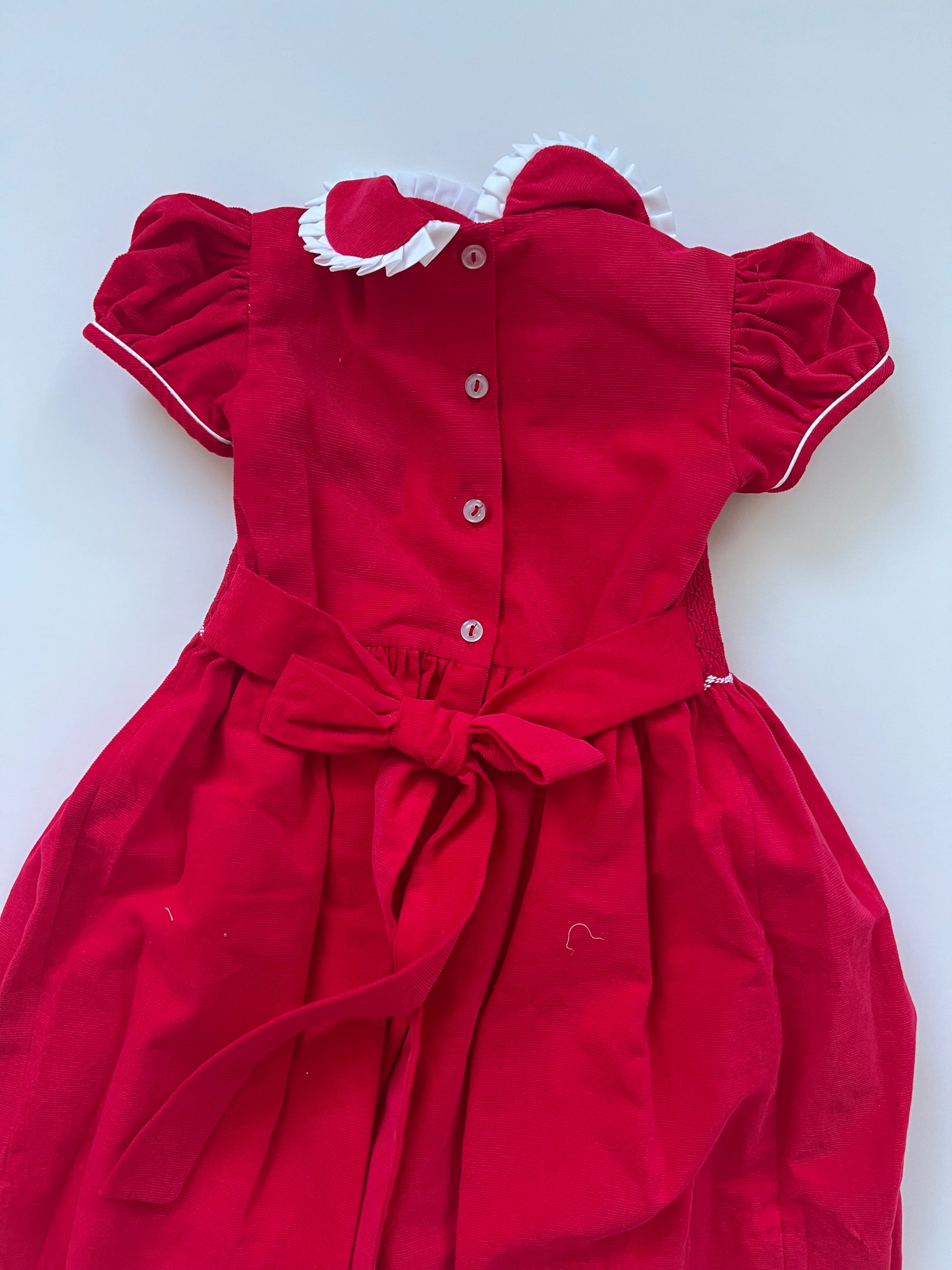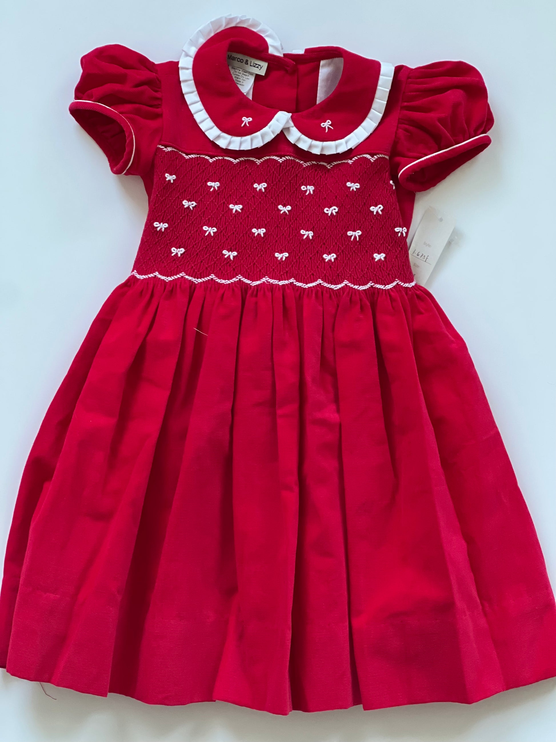 The sweetest puffed sleeve in the most vibrant red color. Finished off with hand smocking and embroidered white bows allover.