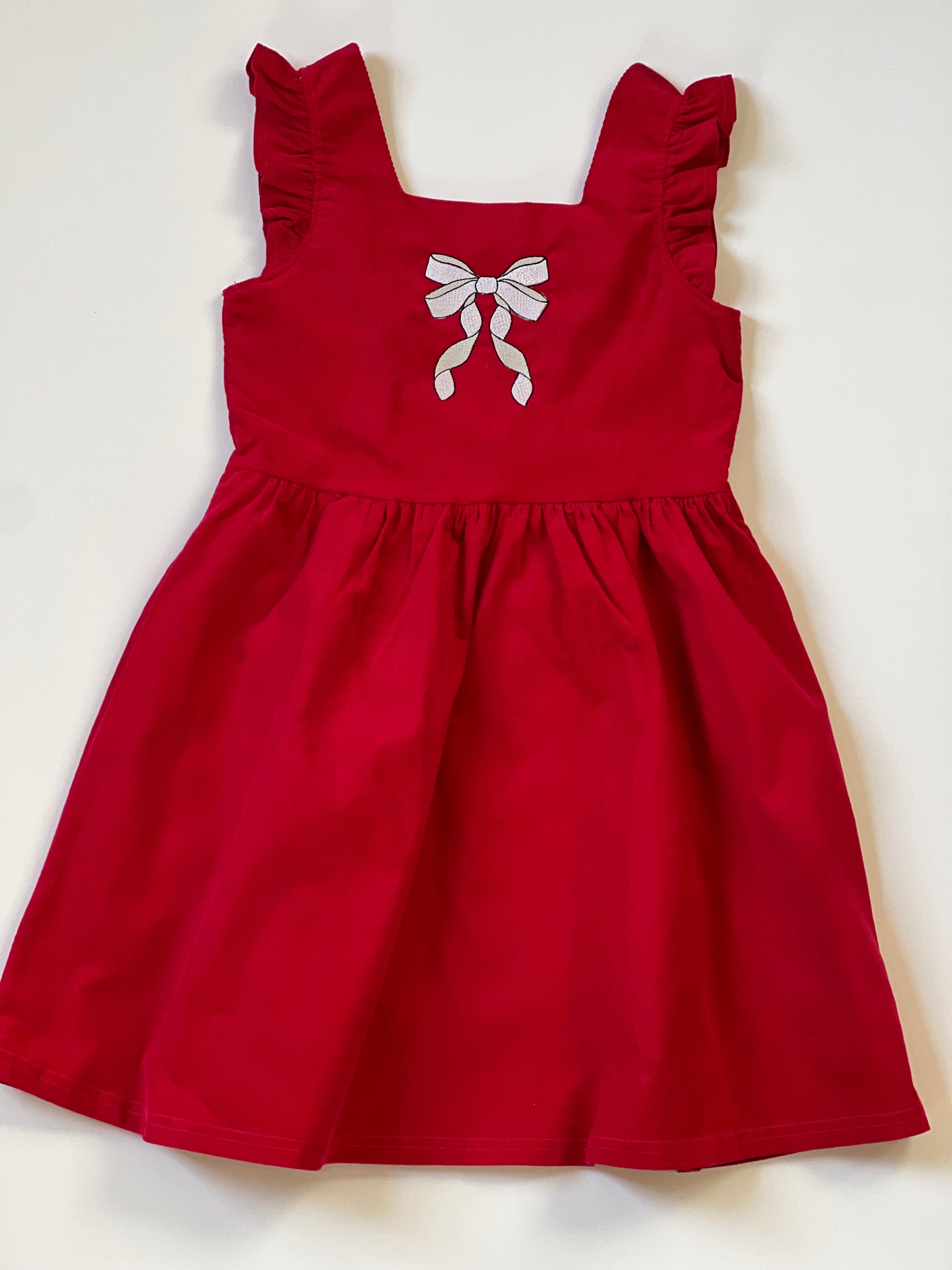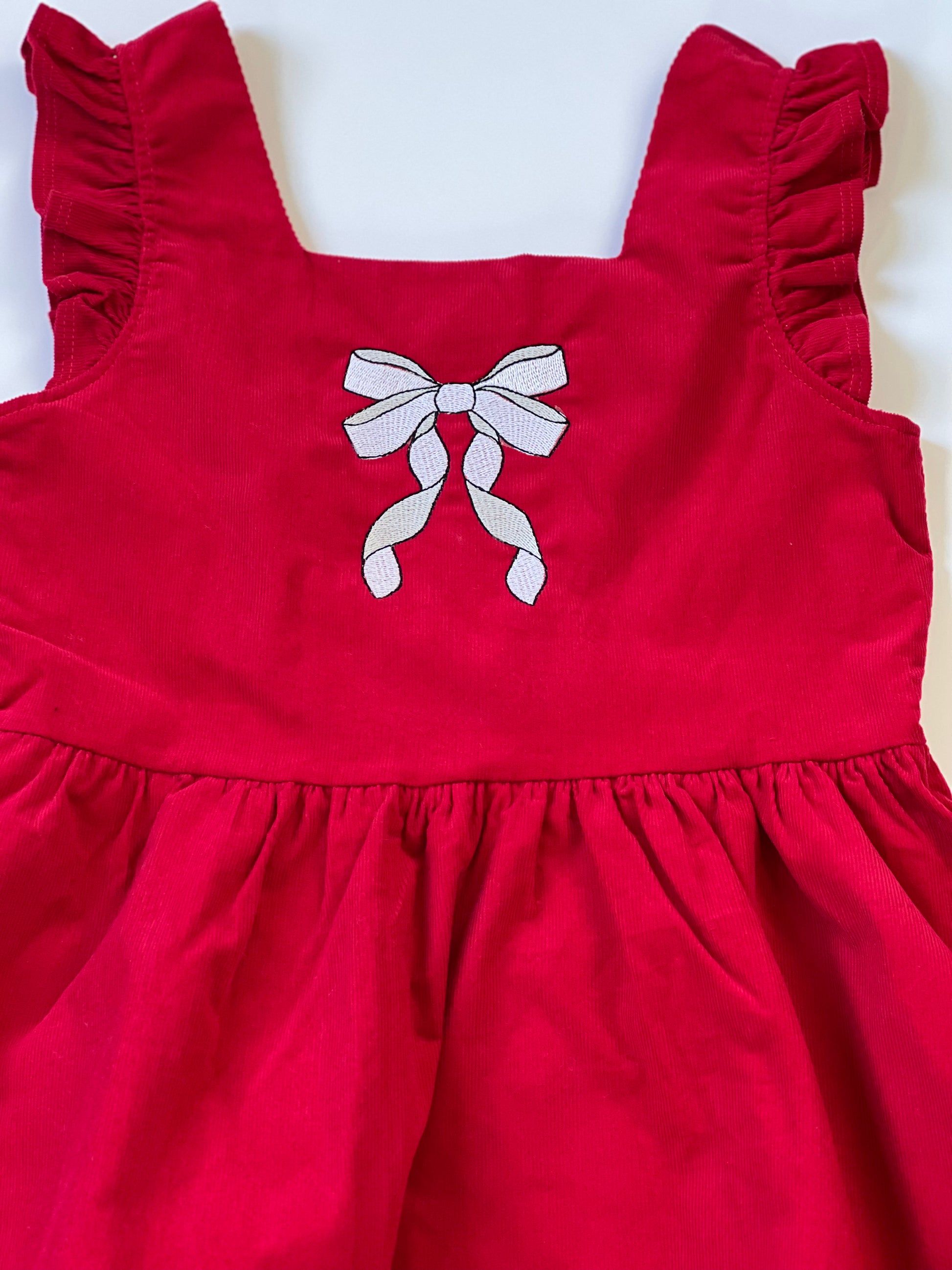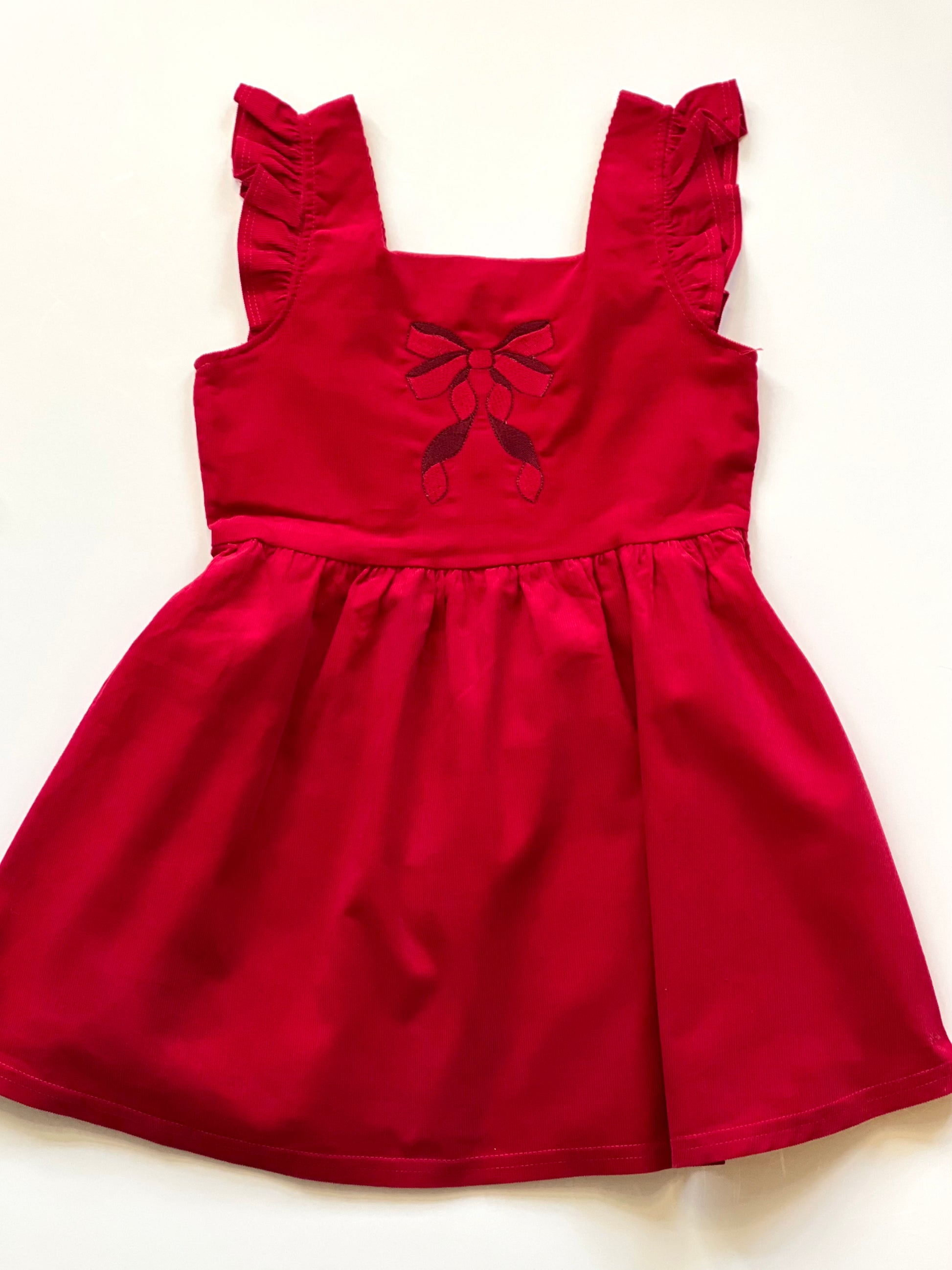 Wale Pin Corduroy Dress Pinafore accents with square neckline Ruffle shoulder detail Faux horn button back Fully Lined