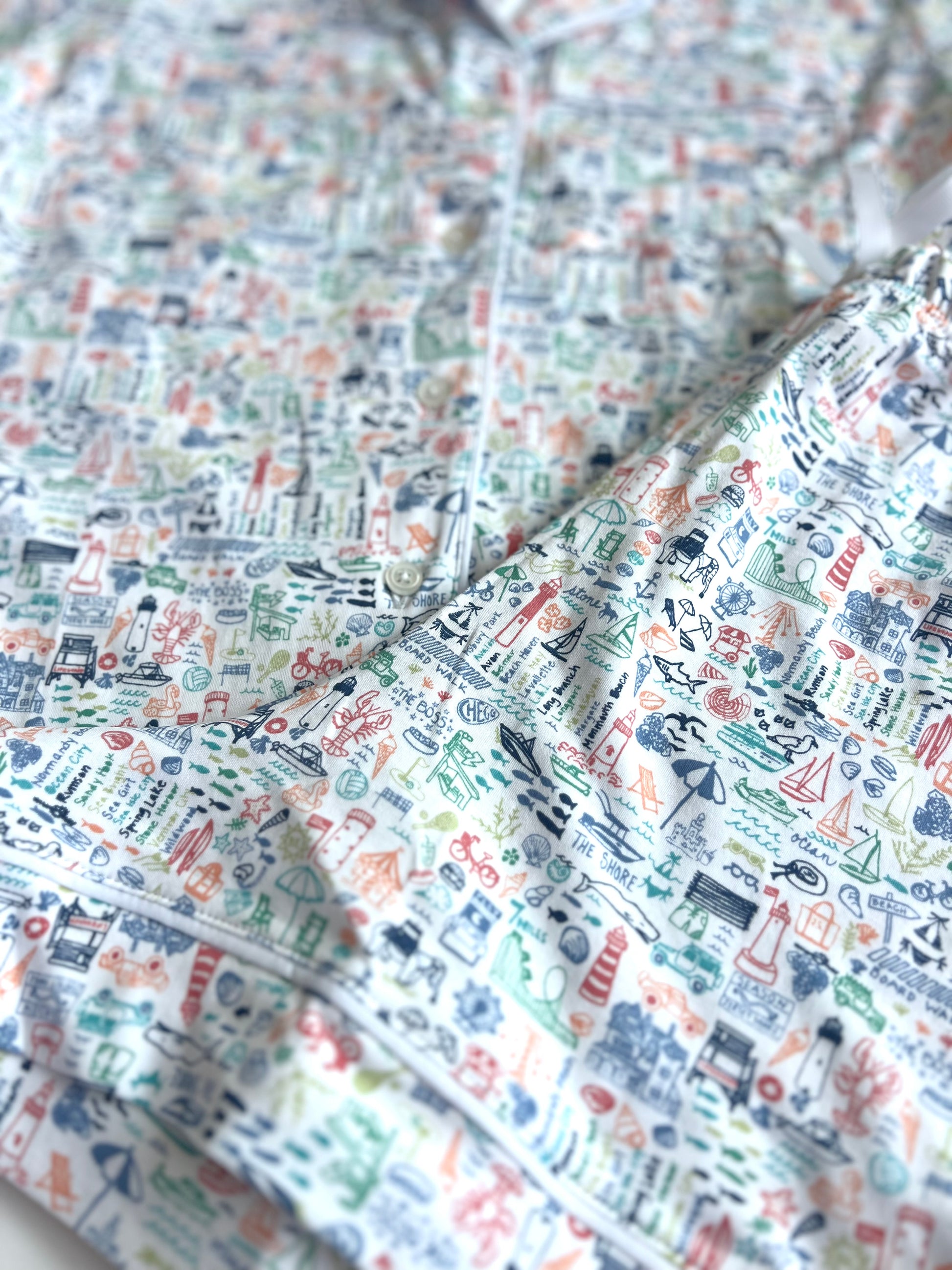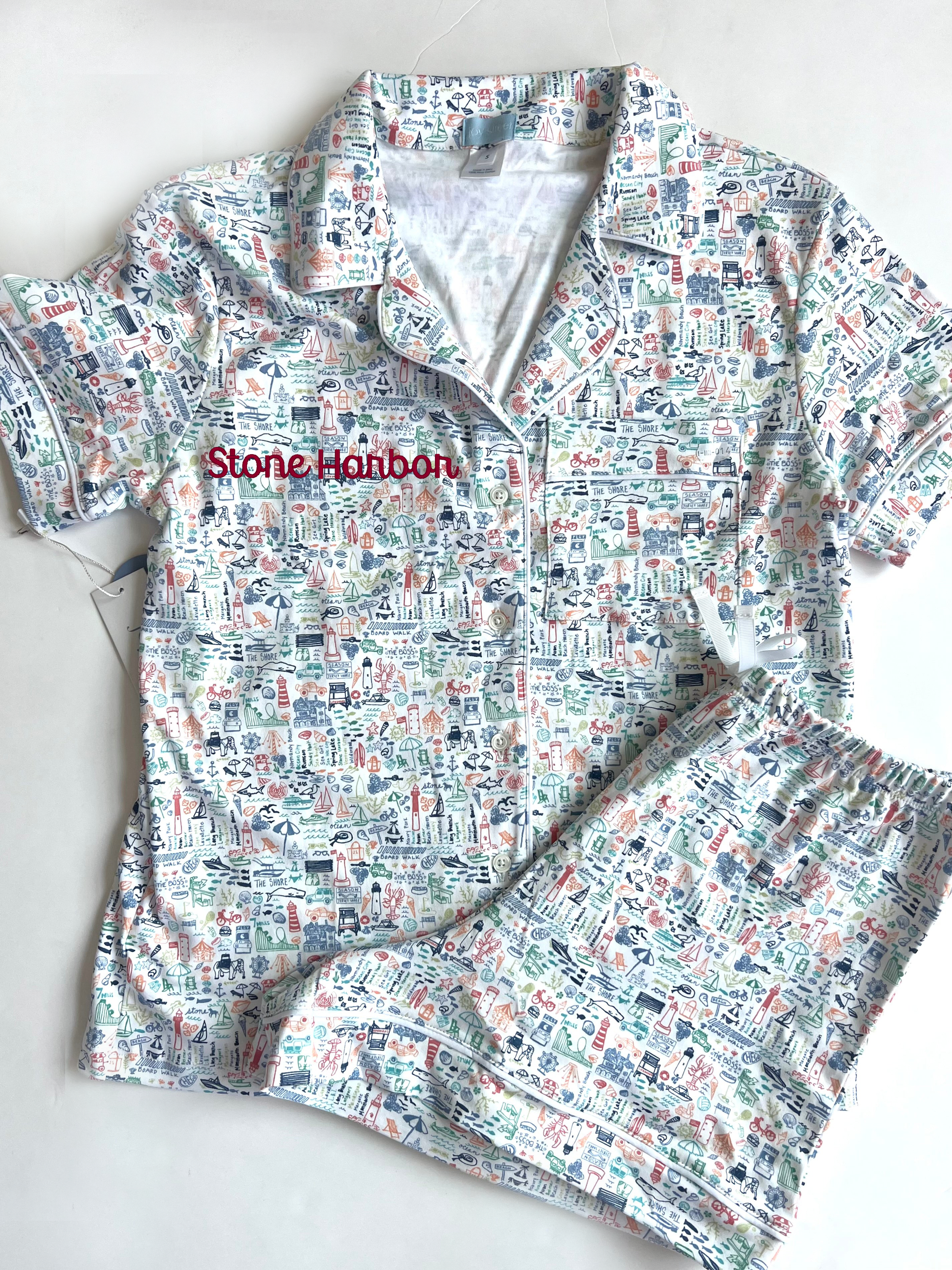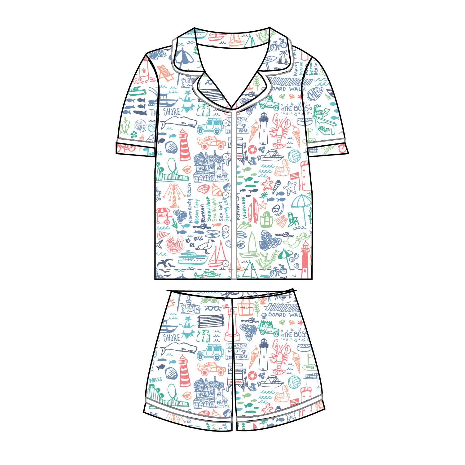 Match your little in our beach town print women's short set. Print close-ups of each town are in the additional images.