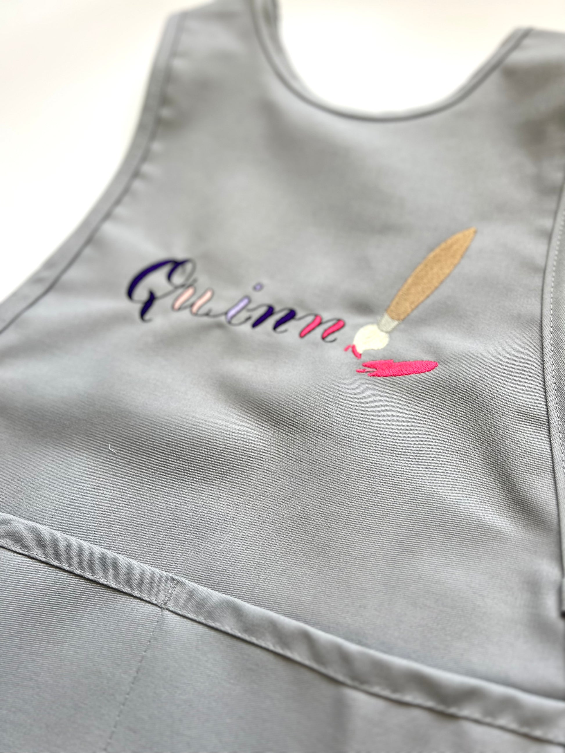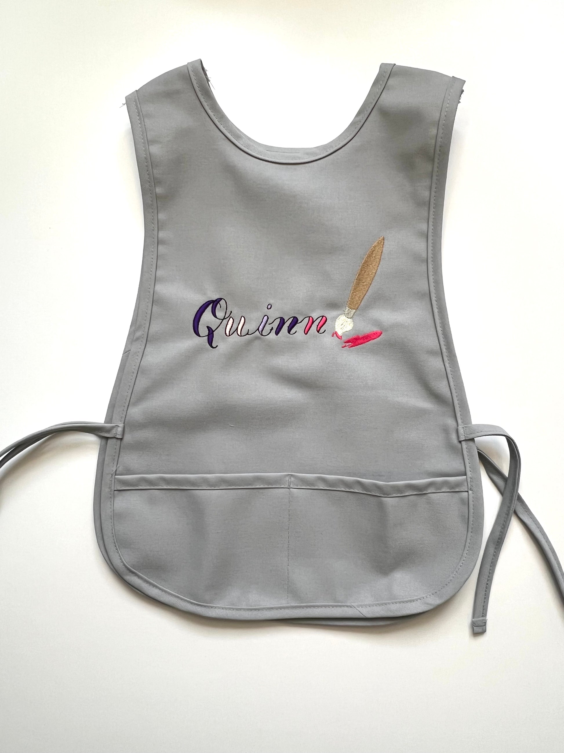 The perfect little smock to let your child's creativity run free! This is a cobbler style apron with 2 pockets and side ties. Choose a font and add the paint brush motif, do a simple name, a family saying, or any motif your child would like!