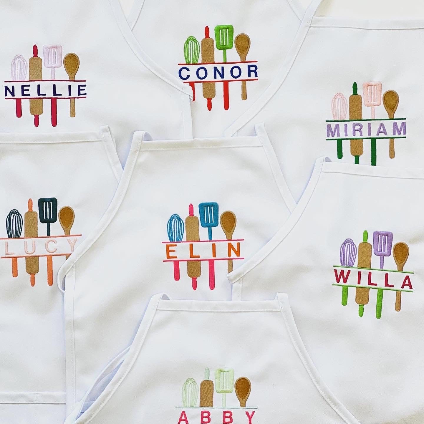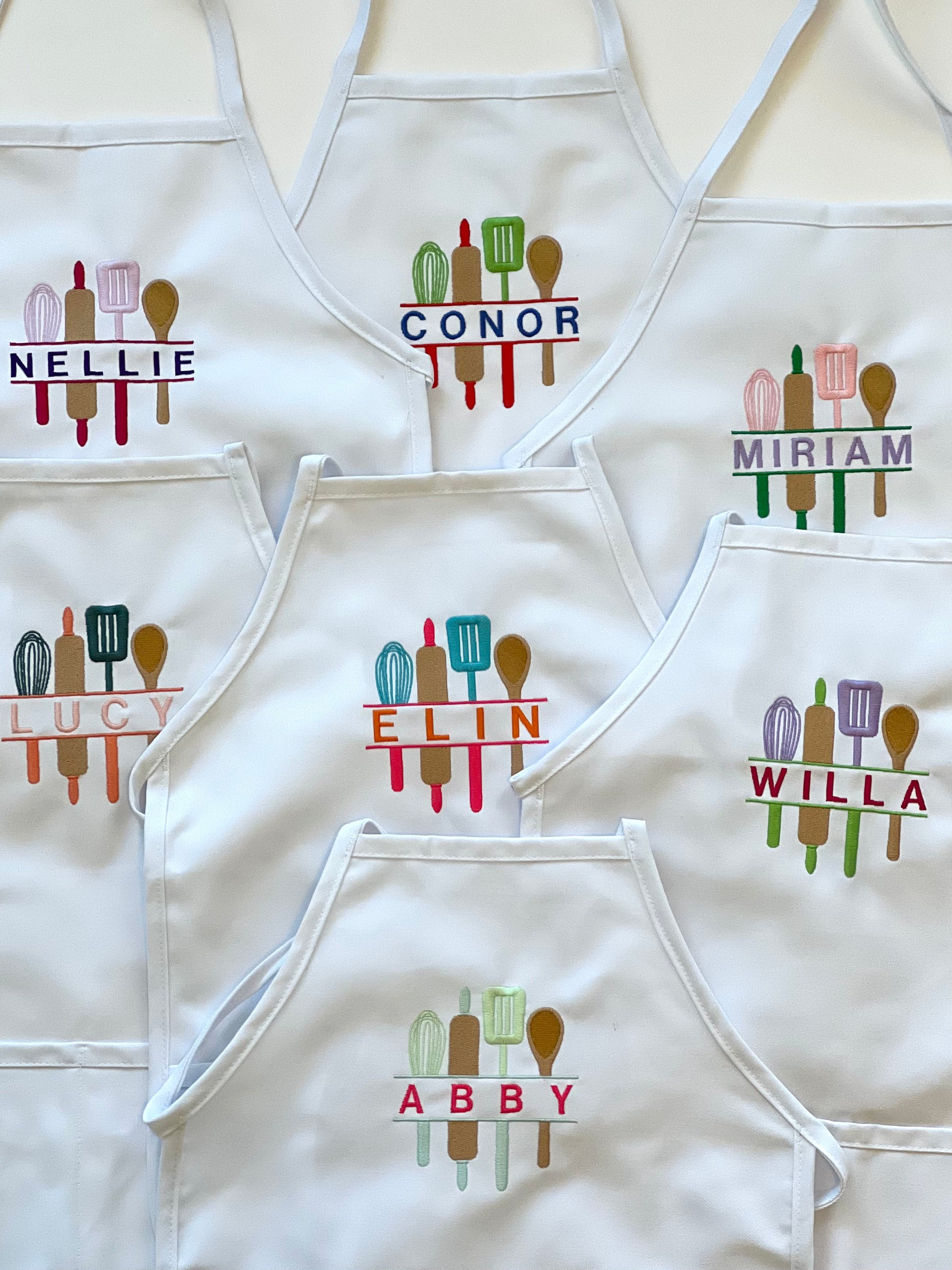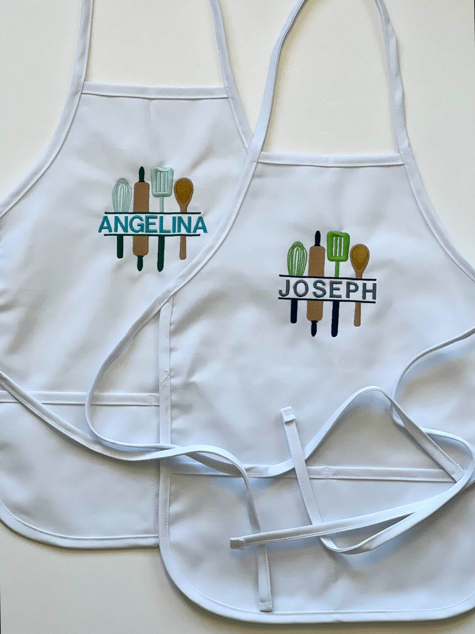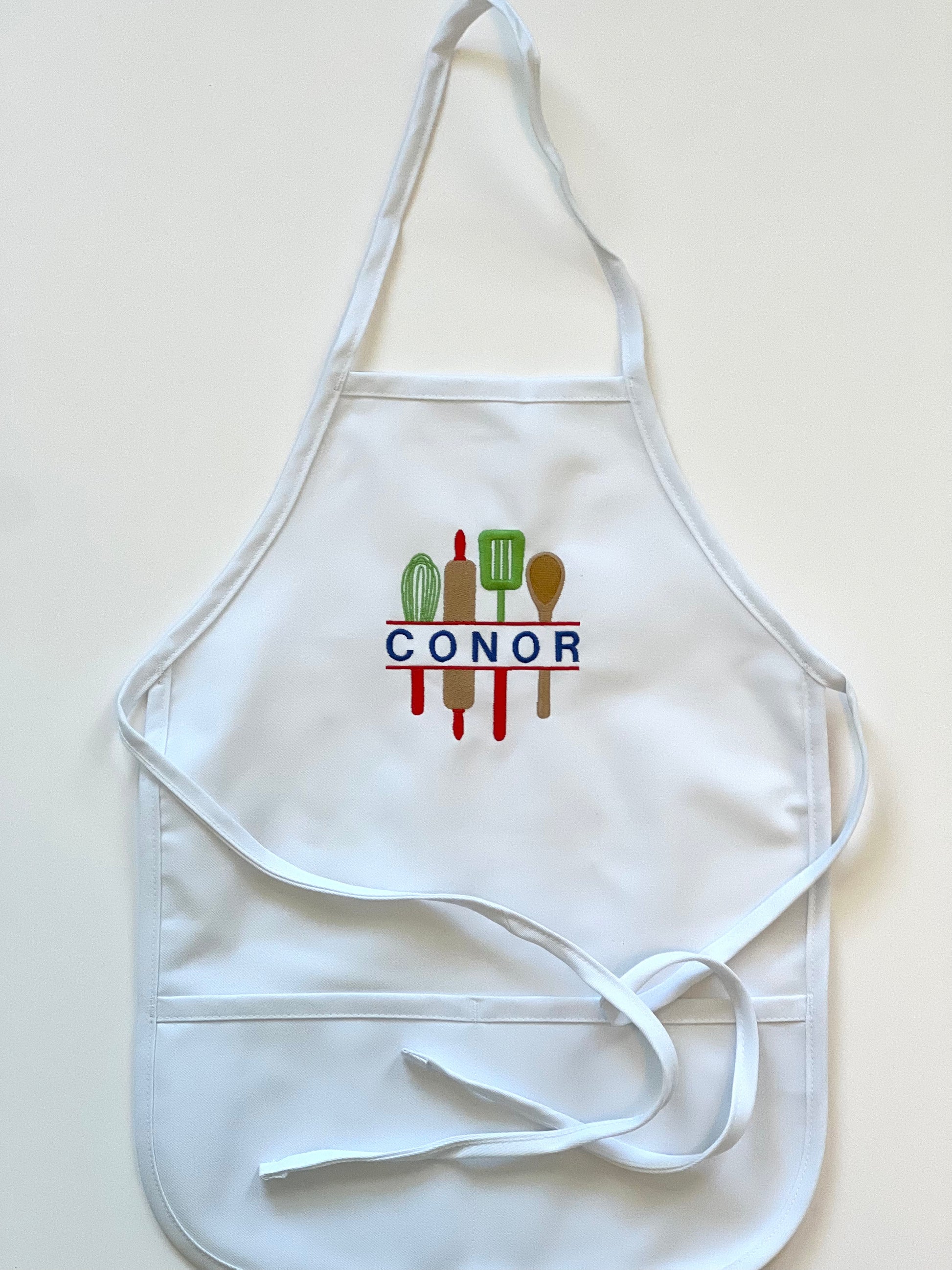 The perfect little apron for your helpful kiddo. This is a bib style apron with 2 pockets and a back tie. Add the baking motif, a simple name, a family saying, or any motif your child would like!