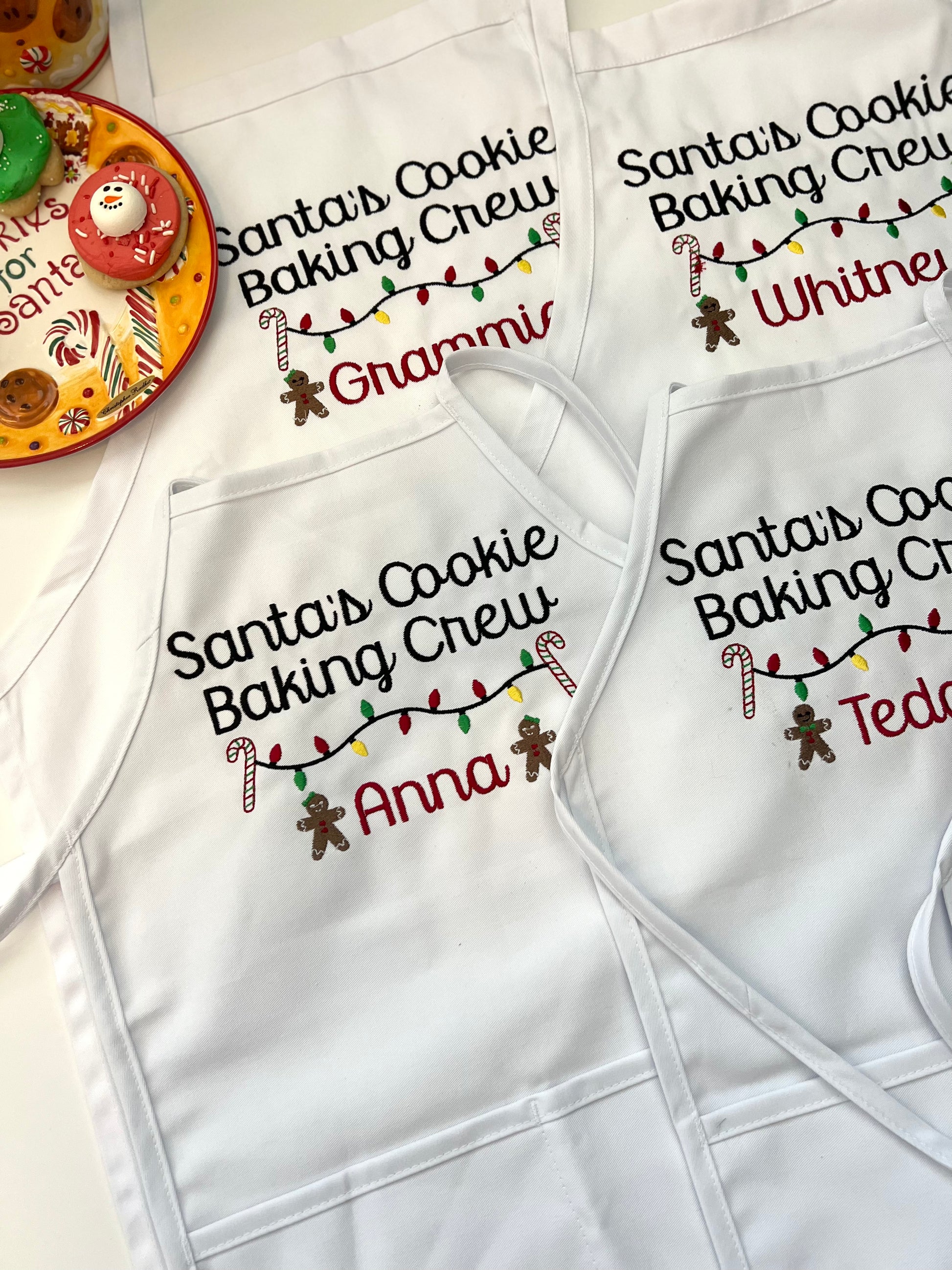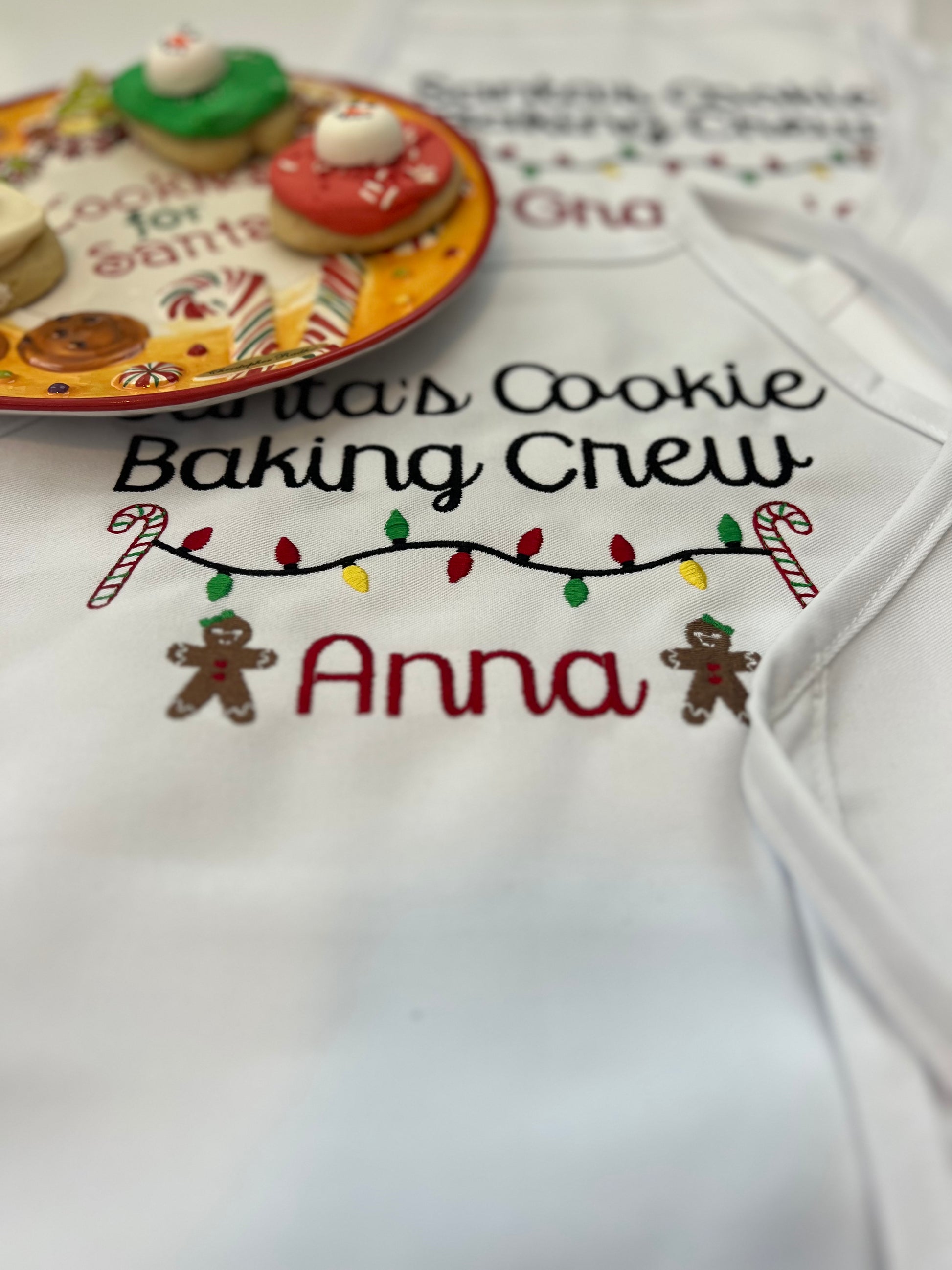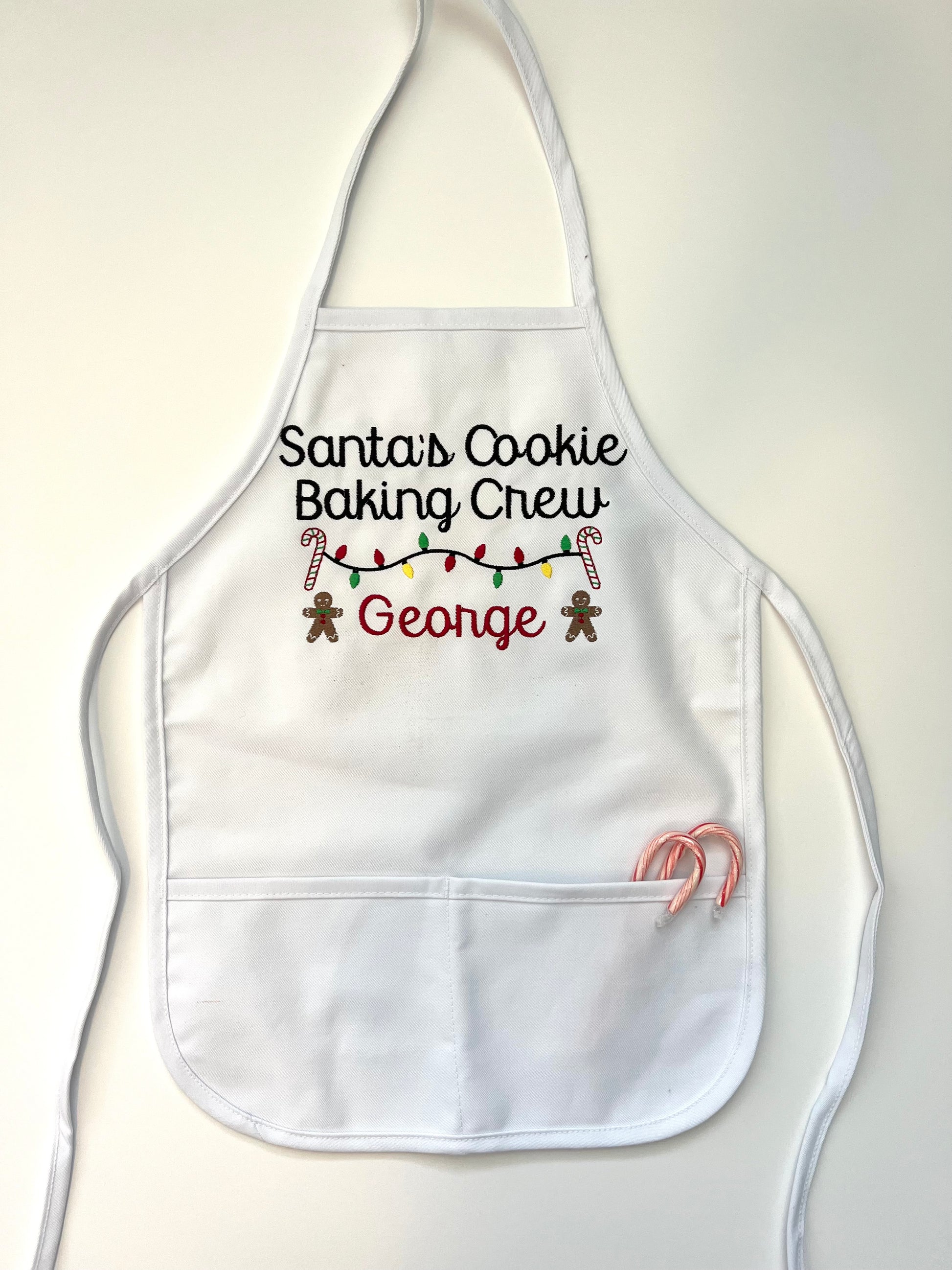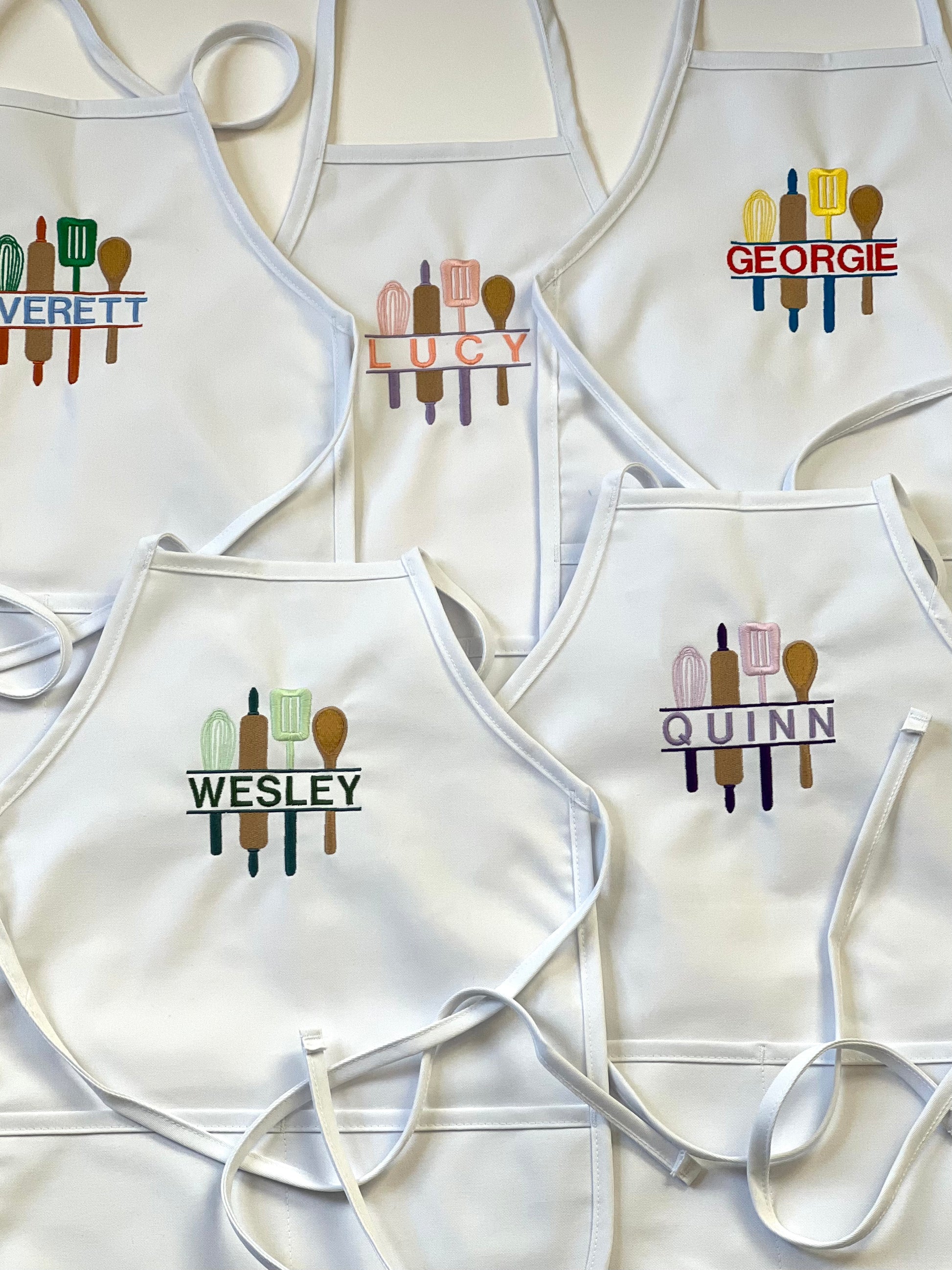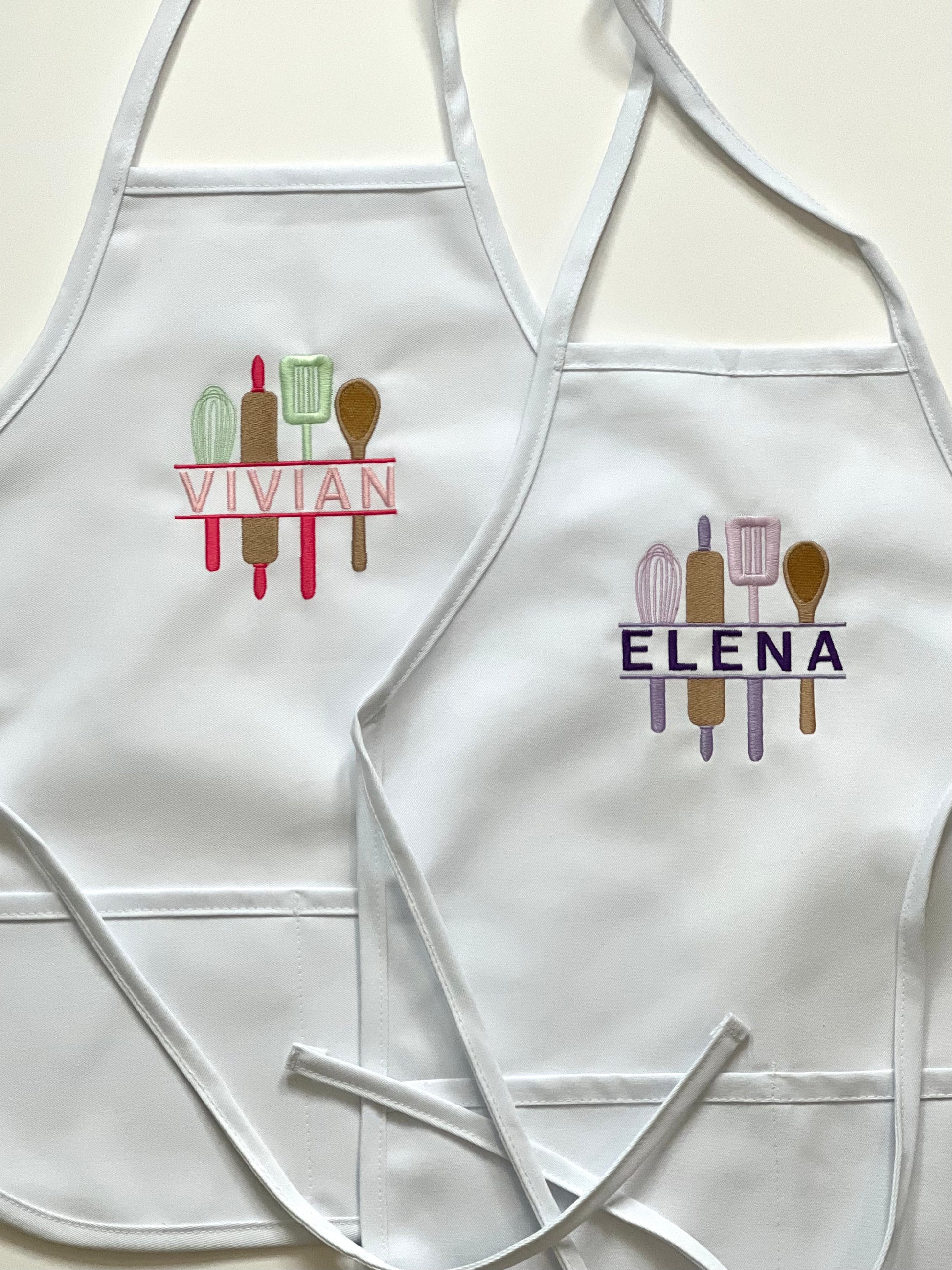 The perfect little apron for your helpful kiddo. This is a bib style apron with 2 pockets and a back tie. Add the baking motif, a simple name, a family saying, or any motif your child would like!