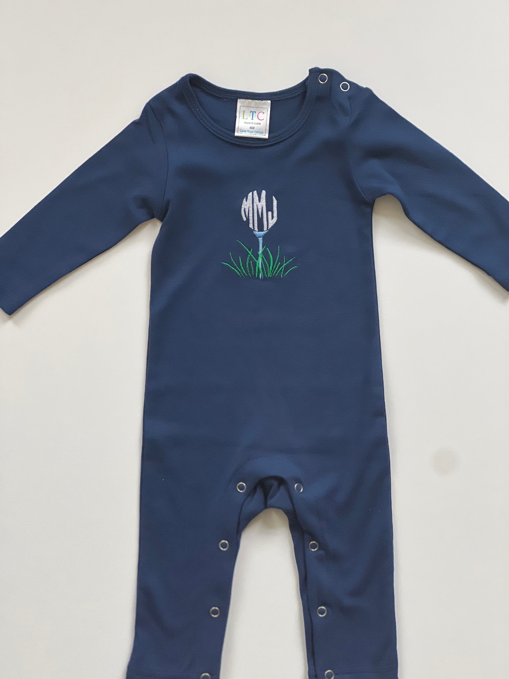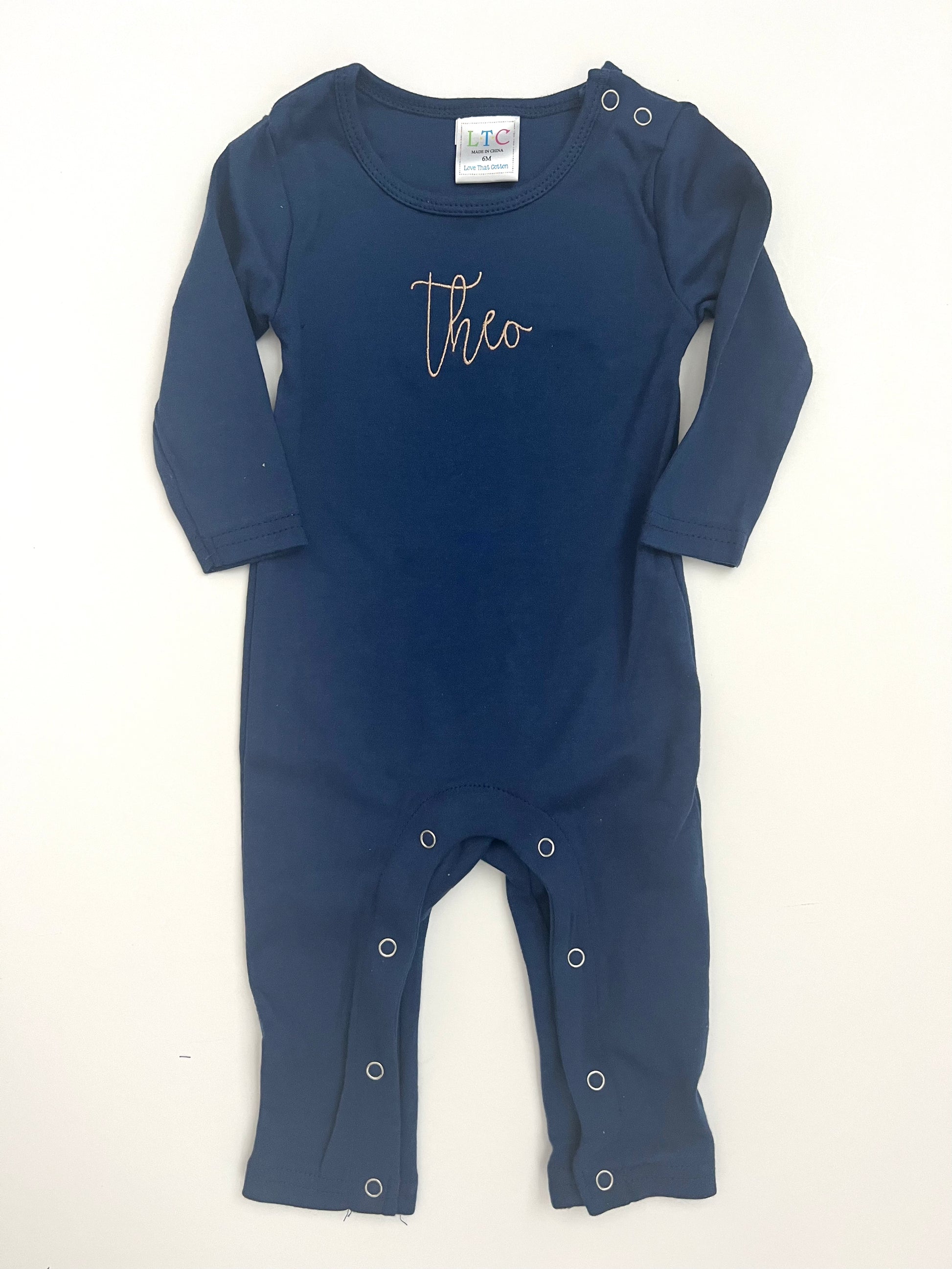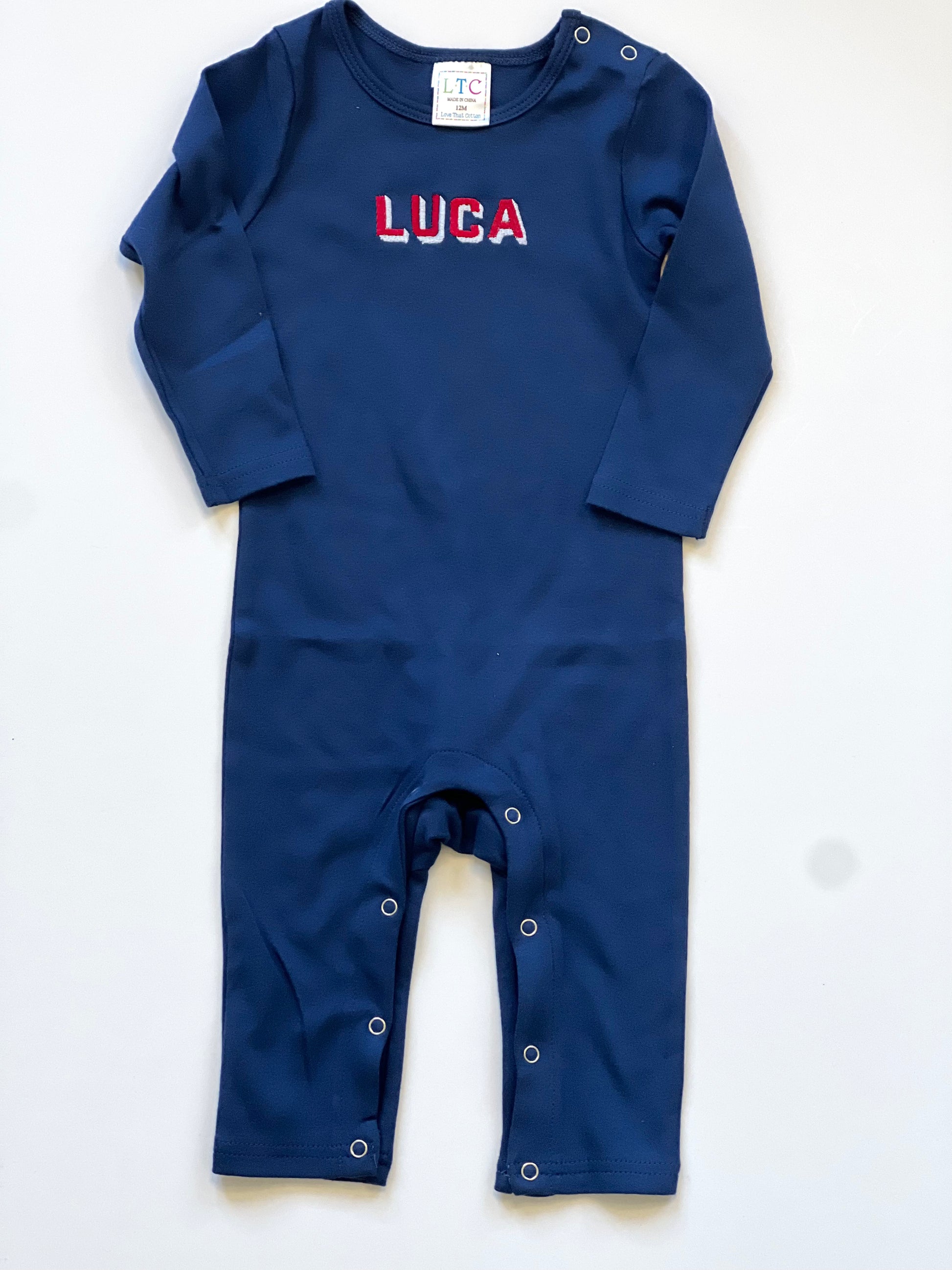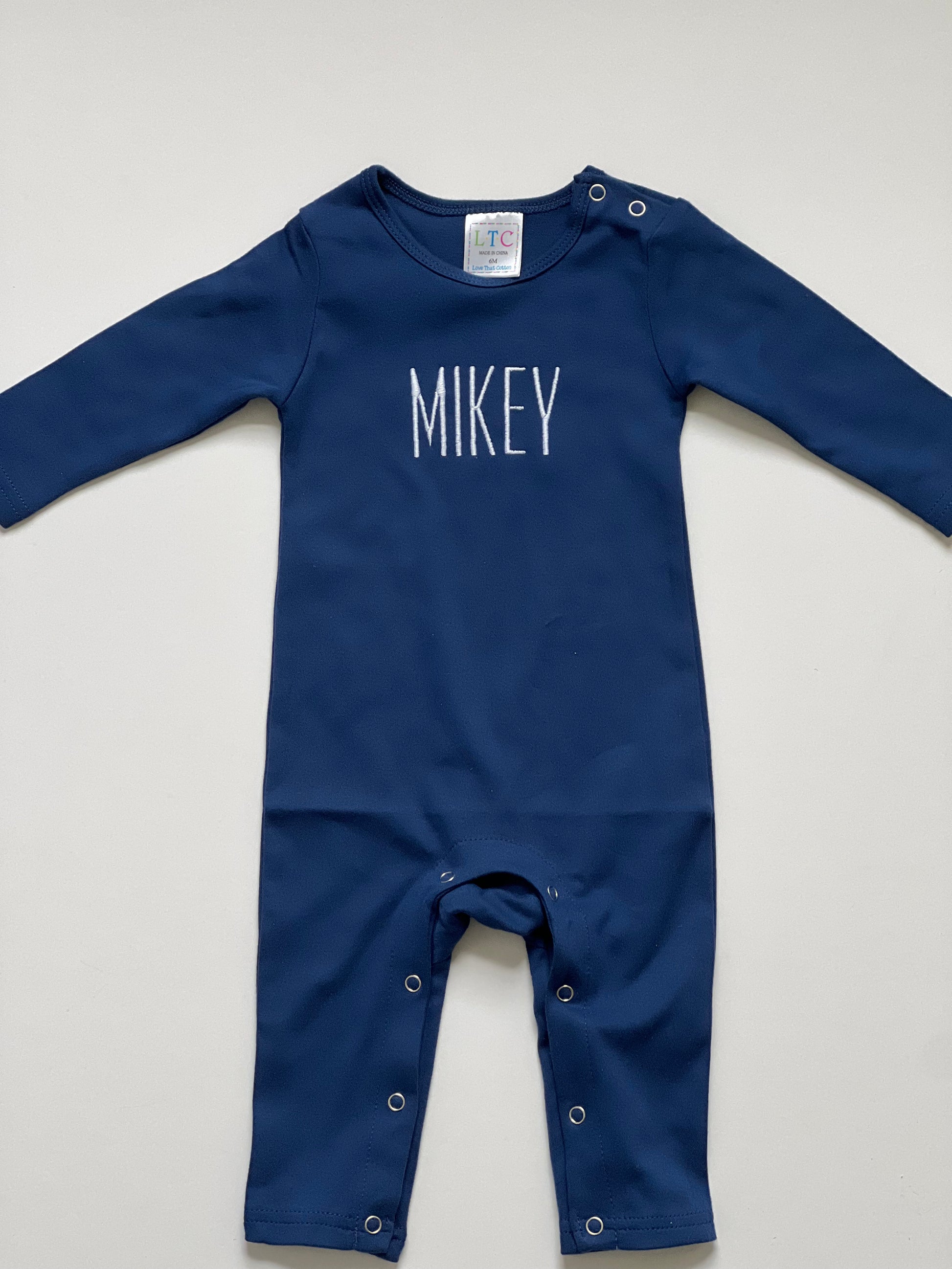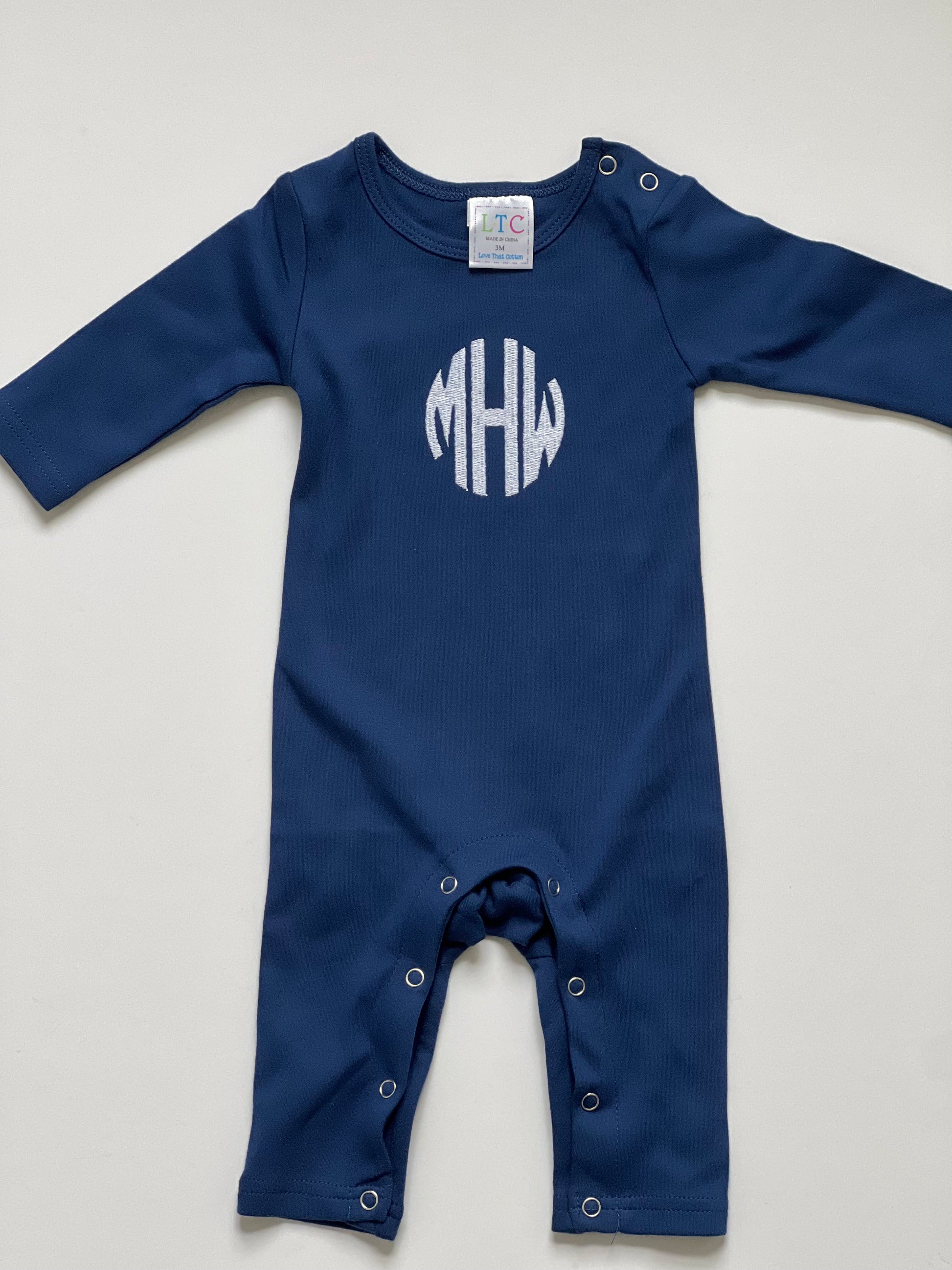 Baby Long Romper. 100 percent interlock cotton 190g Snaps at shoulder Snaps at crotch Double stitched throughout. This winter romper is super soft and perfect for every day wear. The knit fabric lends itself well to embroidery. It has a snaps at the shoulder and along the crotch/legs for ease of changing.