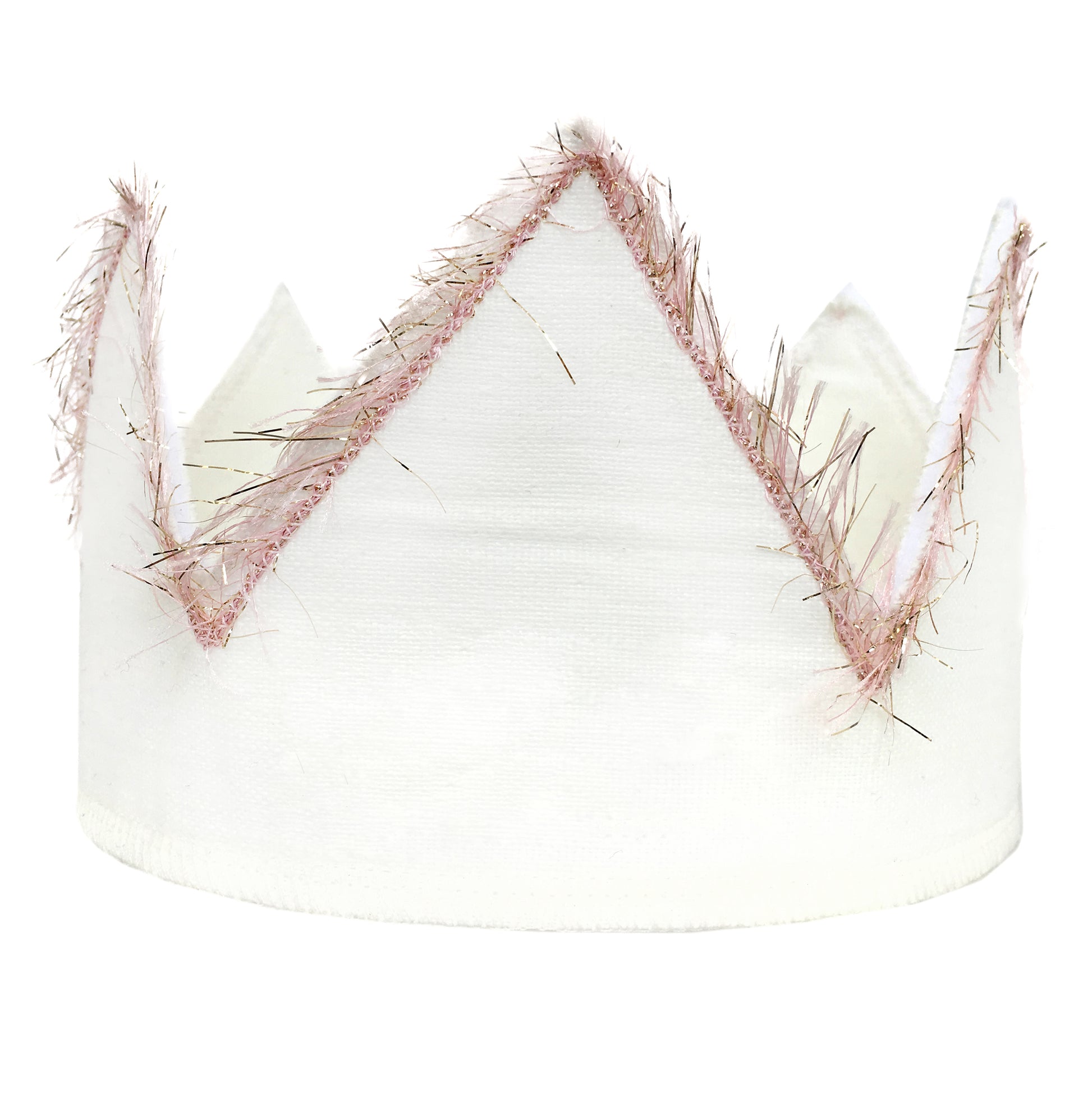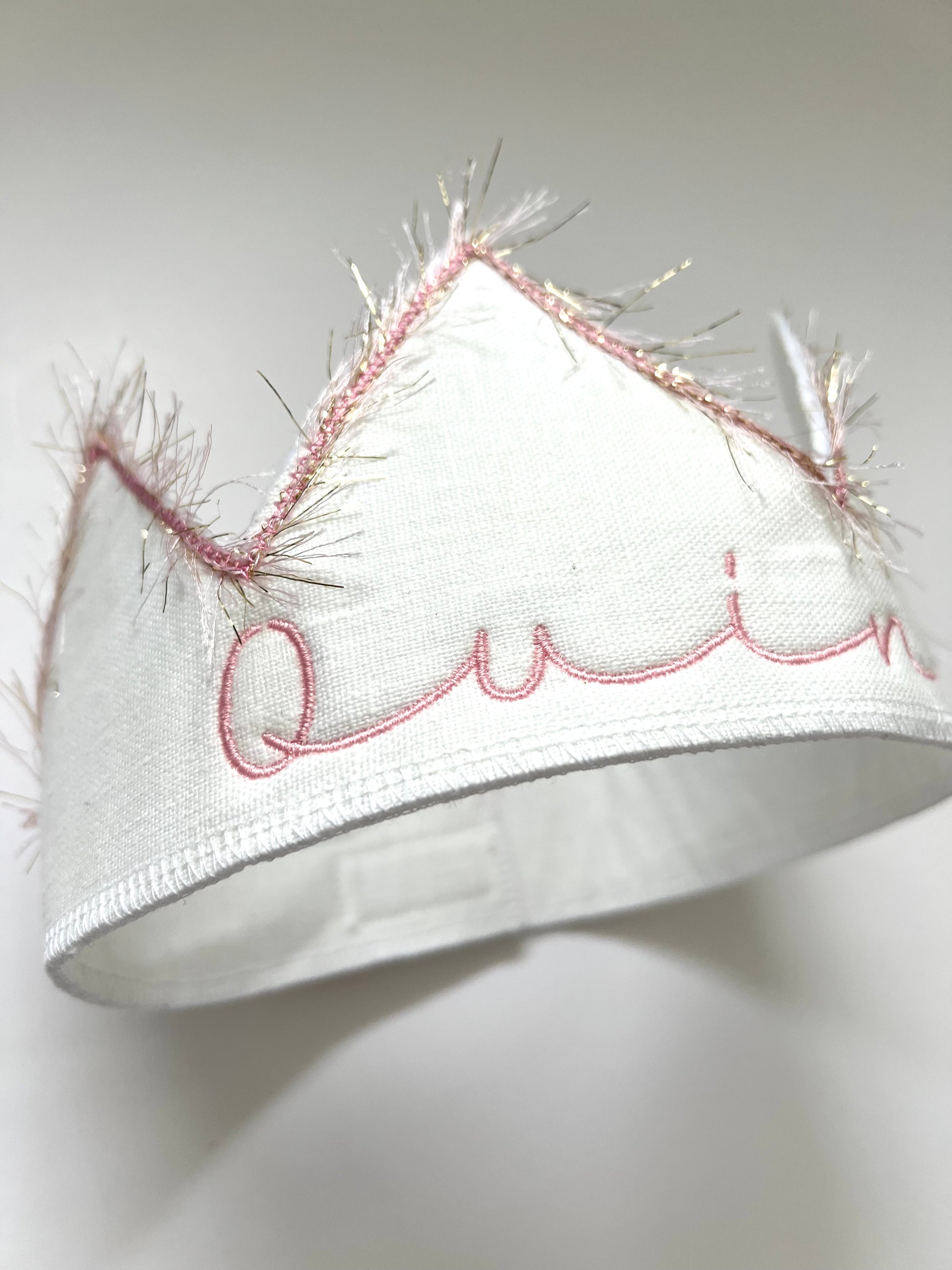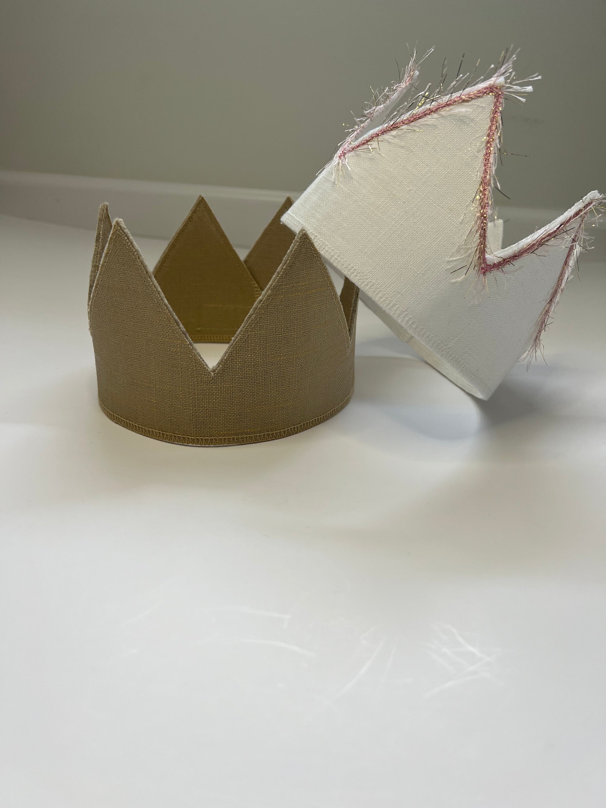 choice of: white linen with pink and gold fringe trim OR gold linen crown
