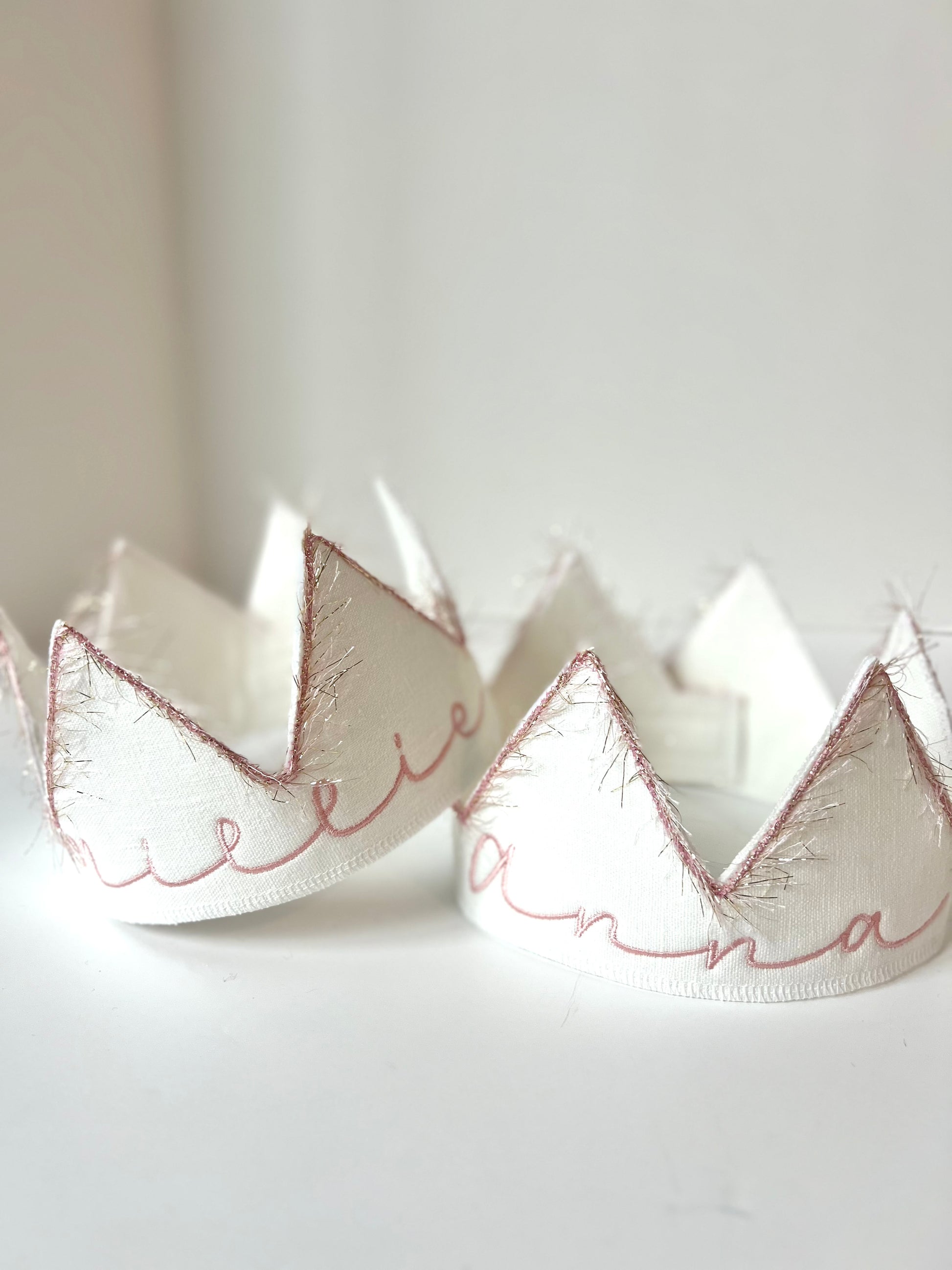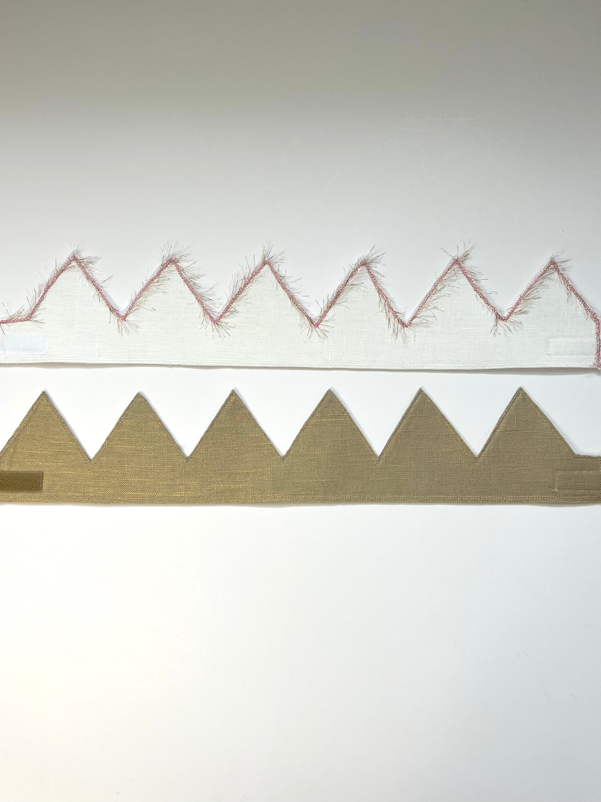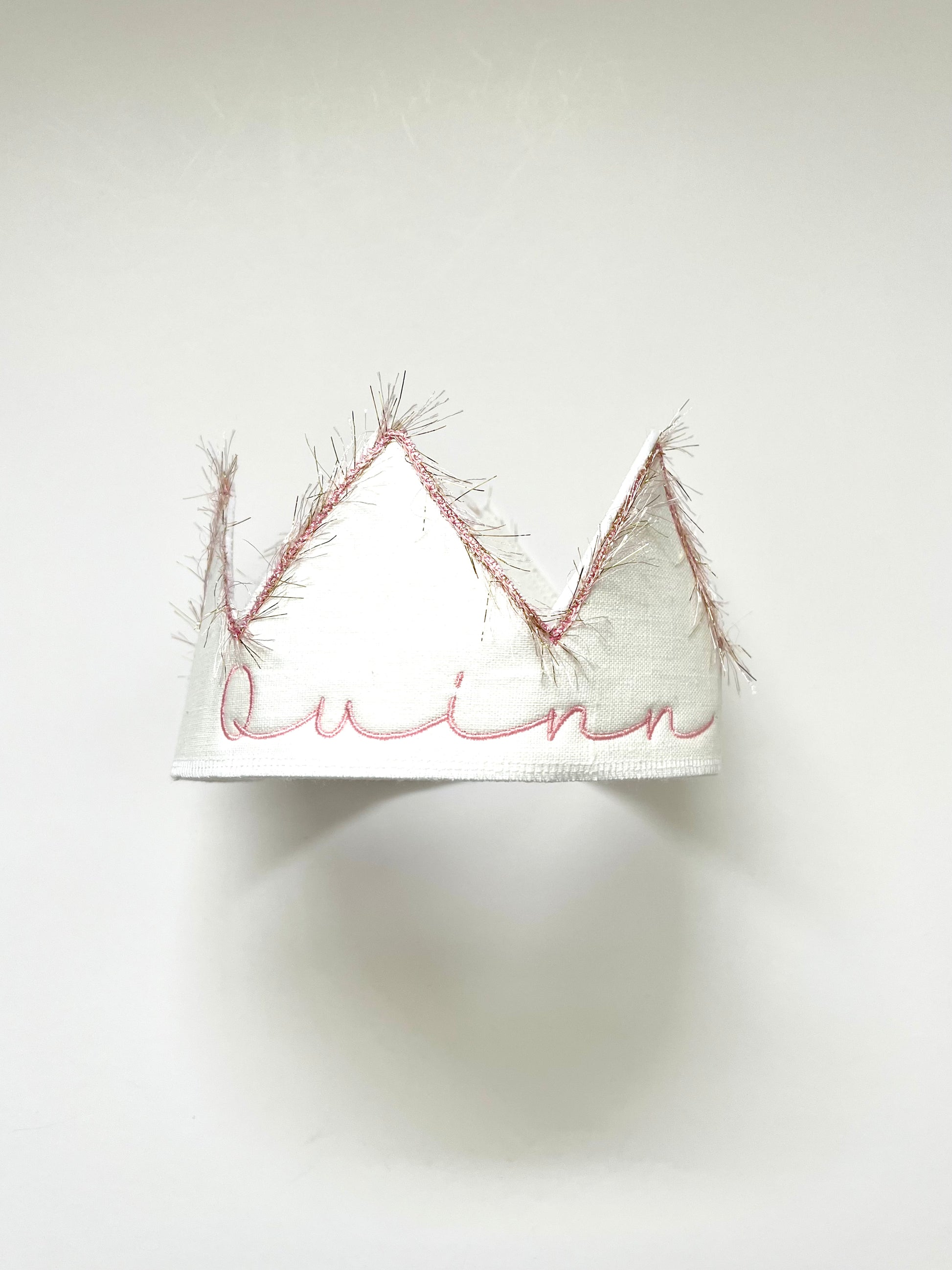 choice of: white linen with pink and gold fringe trim OR gold linen crown