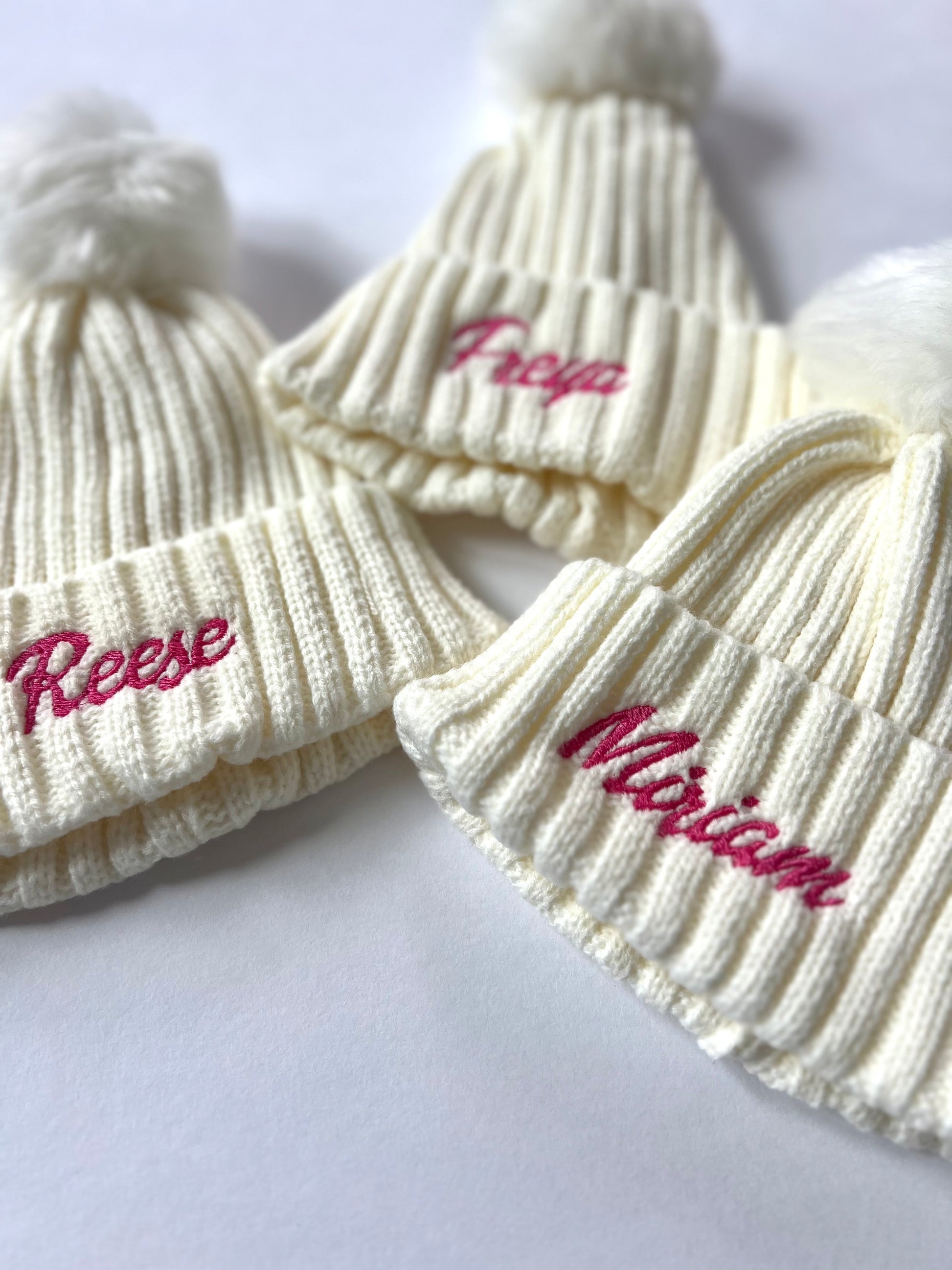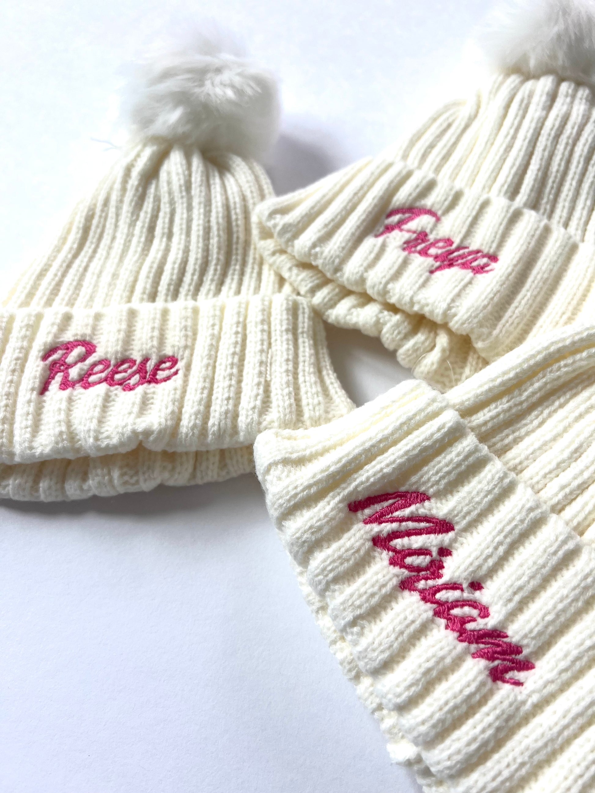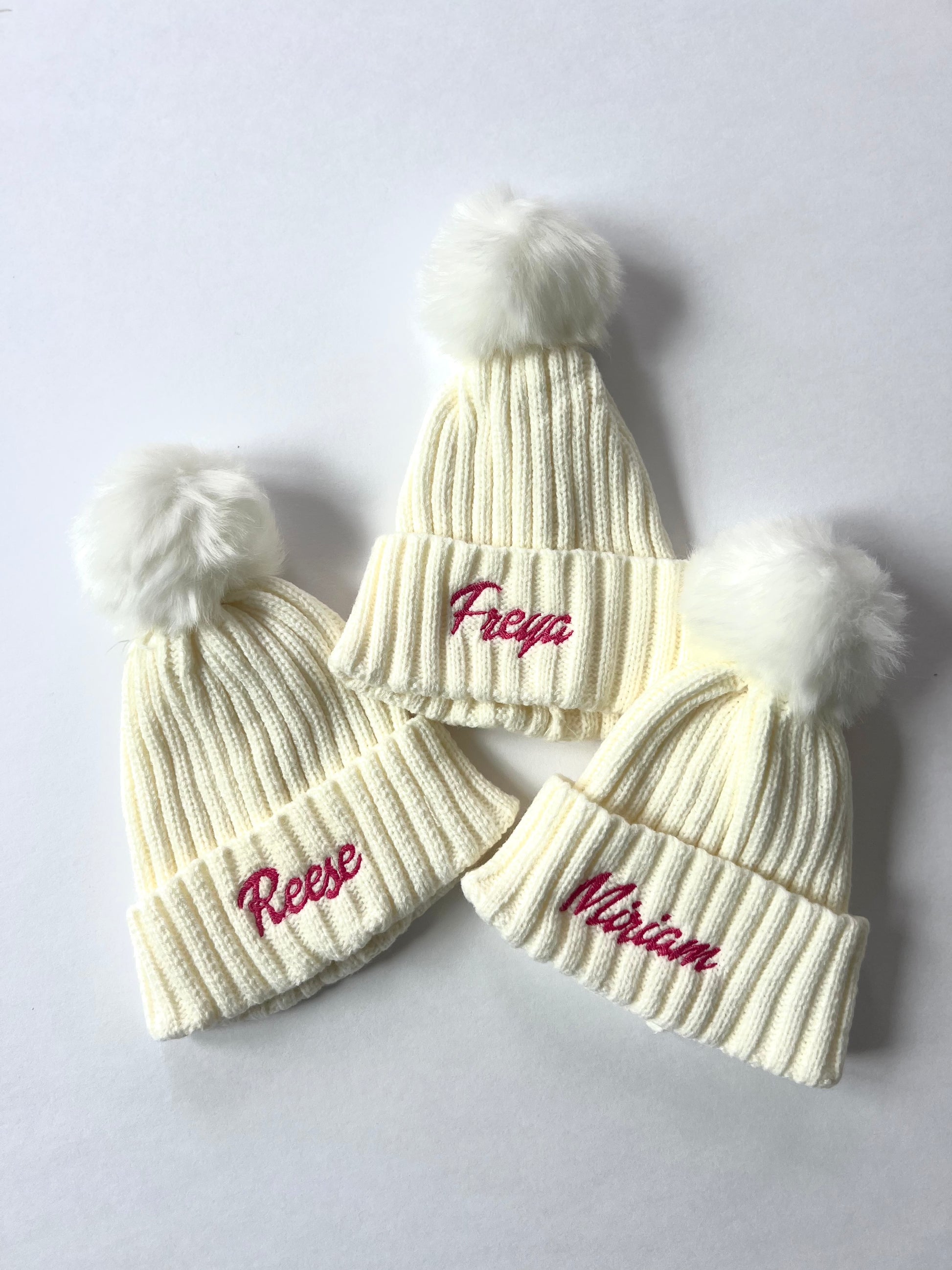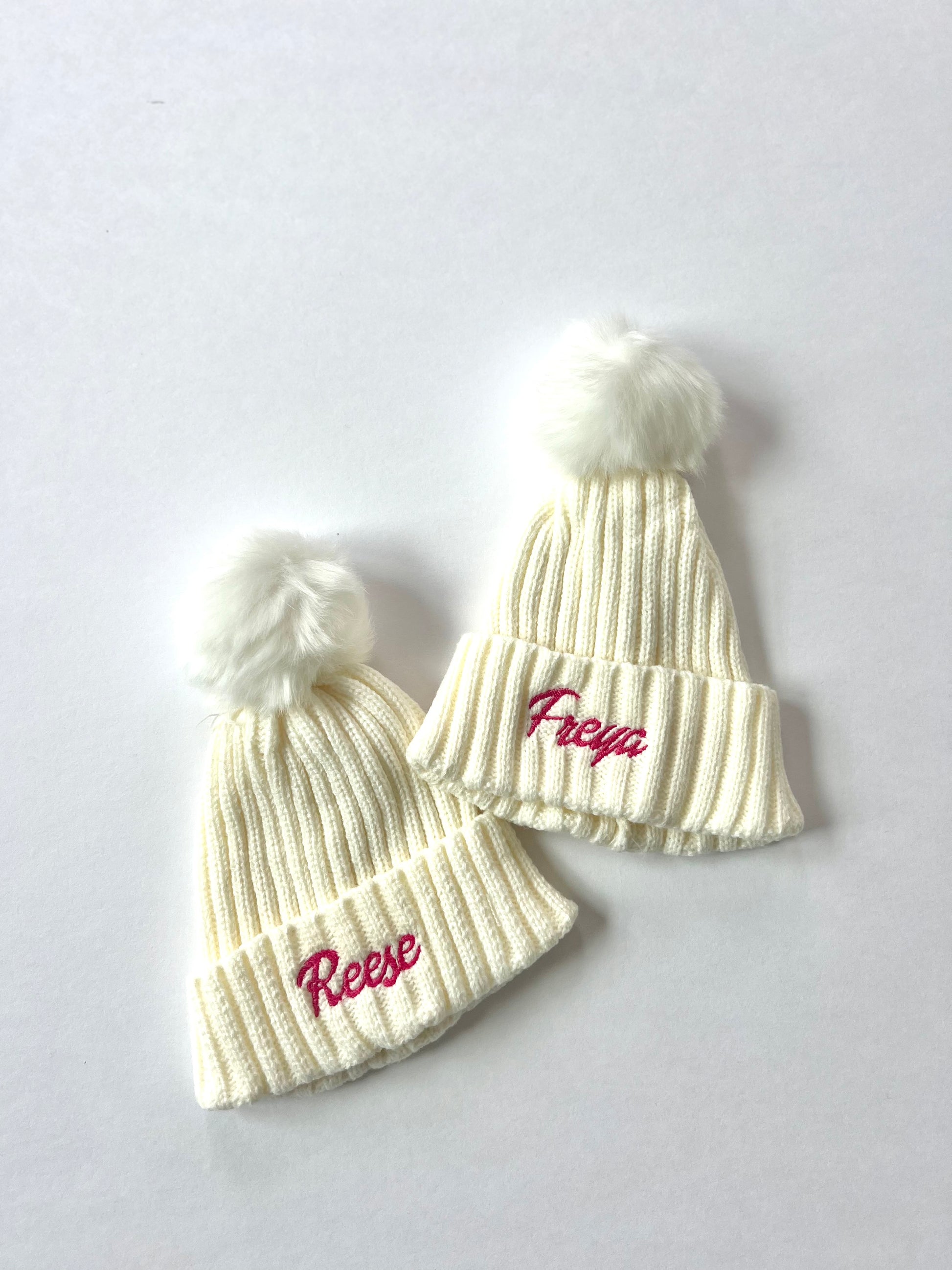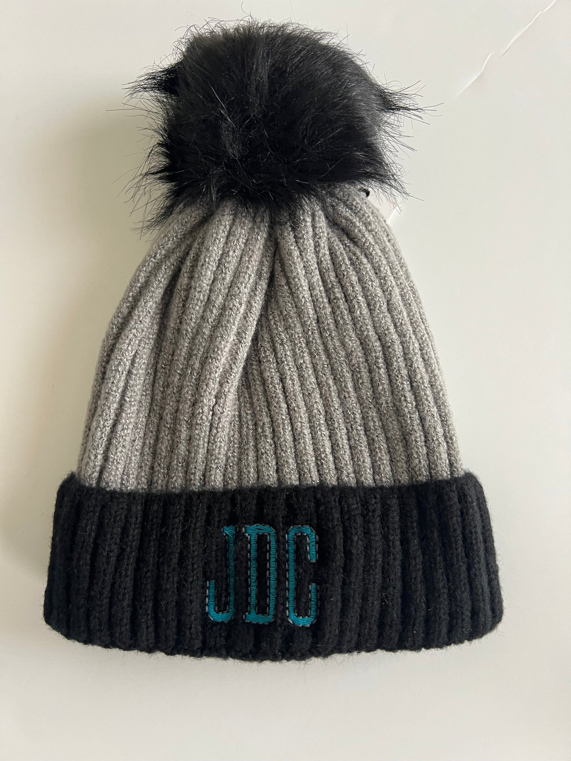 Kid's rib knit beanie with matching color fur pom. 100% Acrylic. Flexible fit.
