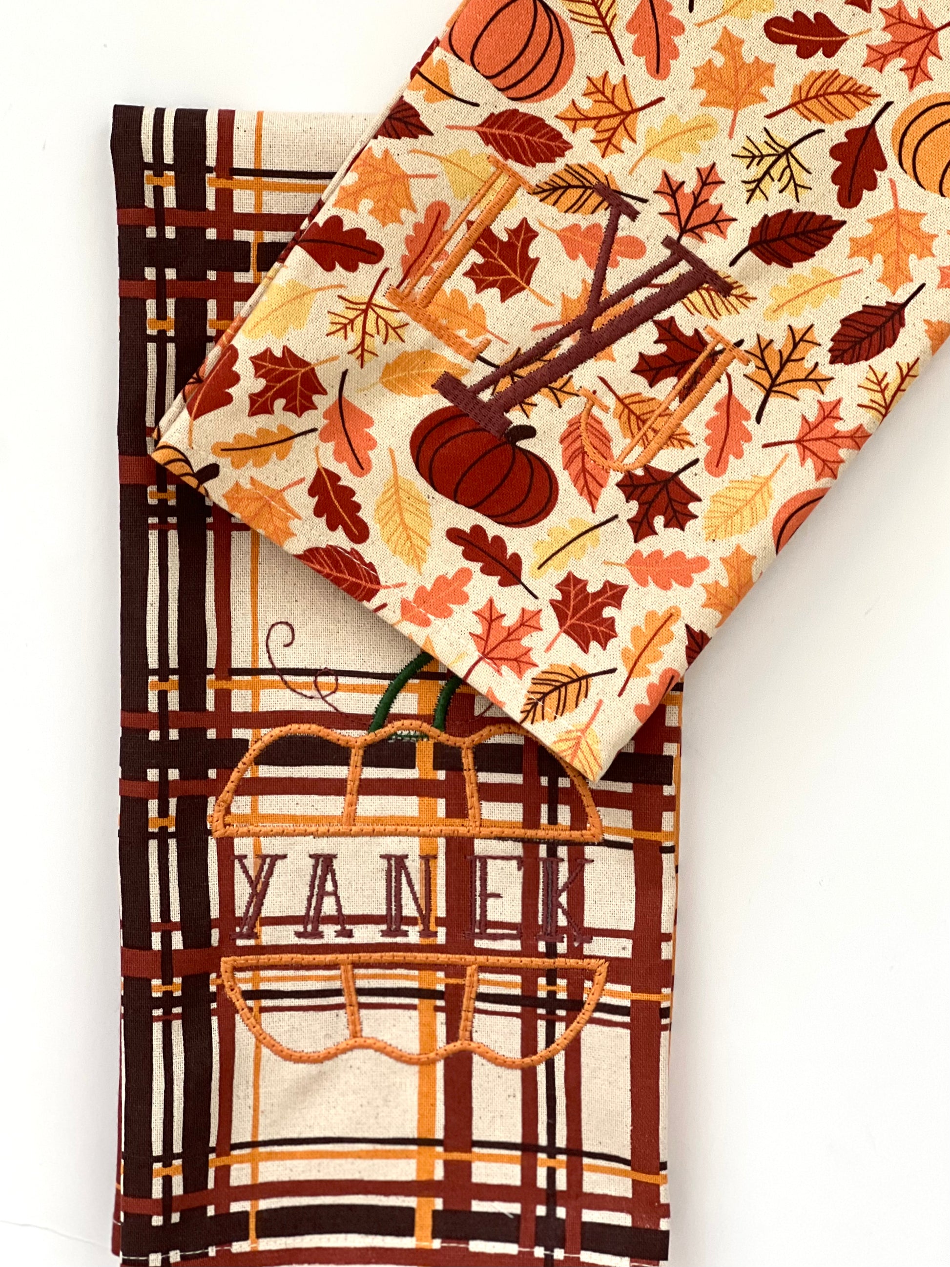 Recommended: monogram on pumpkin/leaf towel. Motif with last name or short saying on the plaid towel.