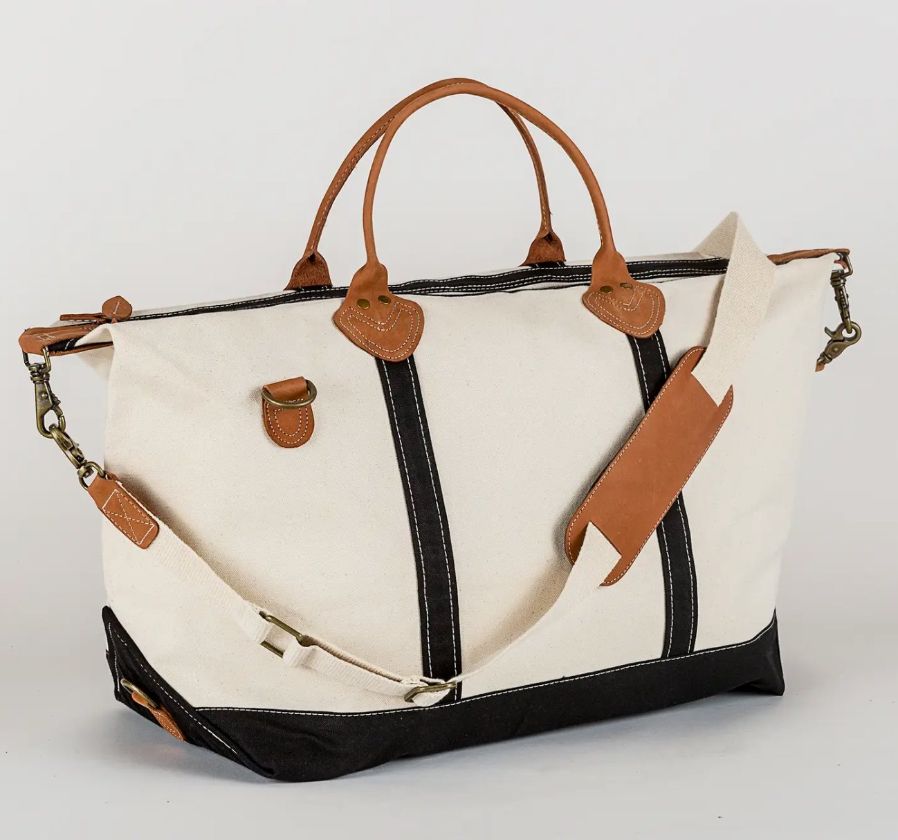 The simple style of this best-selling bag makes it ideal for men and women alike. Made with durable canvas and sturdy construction, its classic good looks and generous size will be a favorite for years. Large enough to pack for a quick weekend or longer getaways, this bags works great as a carry-on. Crafted from eco-friendly, heavyweight cotton canvas 7” drop rolled leather handles Antique brass hardware Adjustable cotton shoulder strap with leather comfort pad to protect your shoulder Interior hanging pocket with zippered closure Size: 28" x 15" x 10".