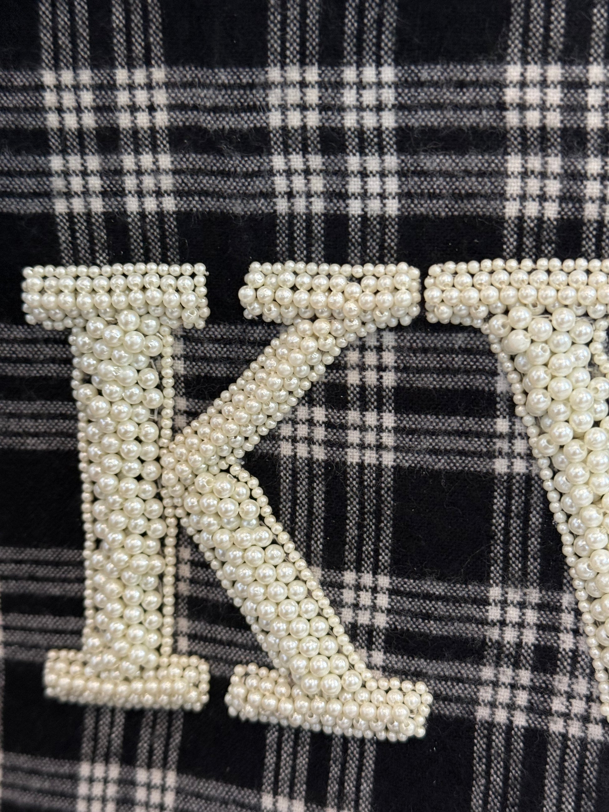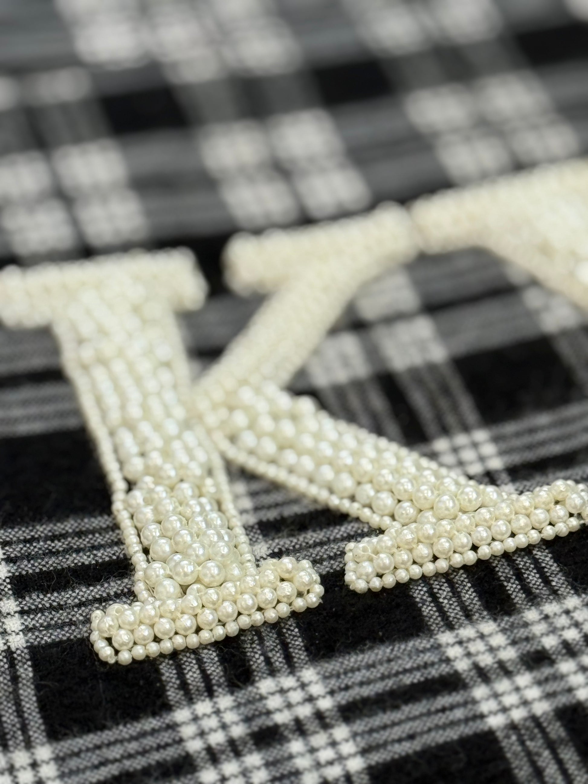 Draped in a cozy flannel fabric and then unexpectedly personalized with various faux pearls. It's all things cold weather cozy but still oh so glam.