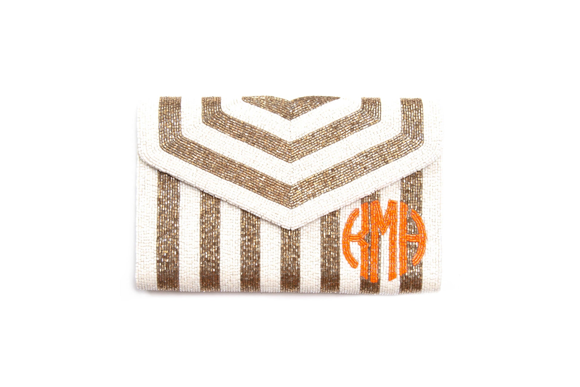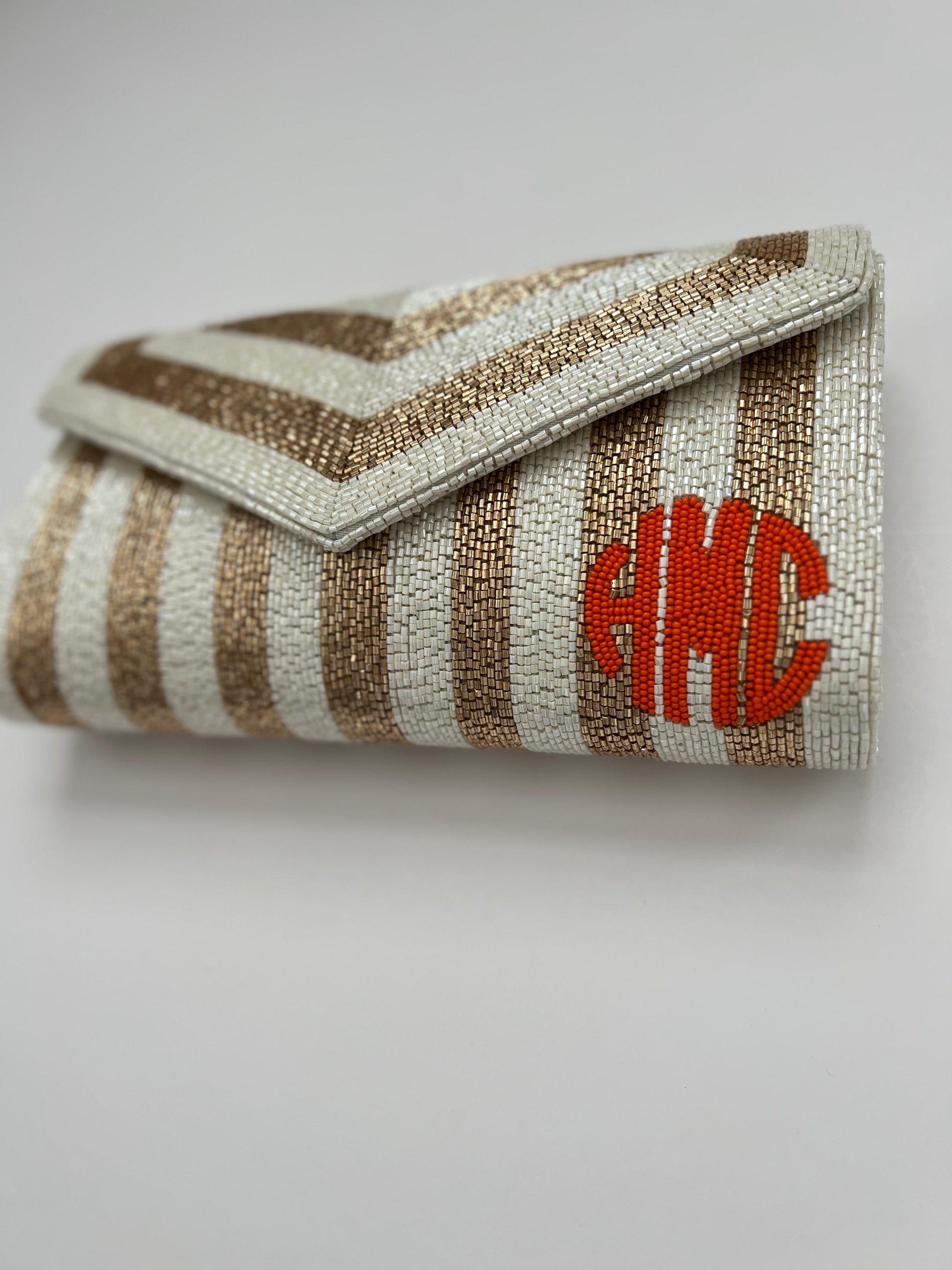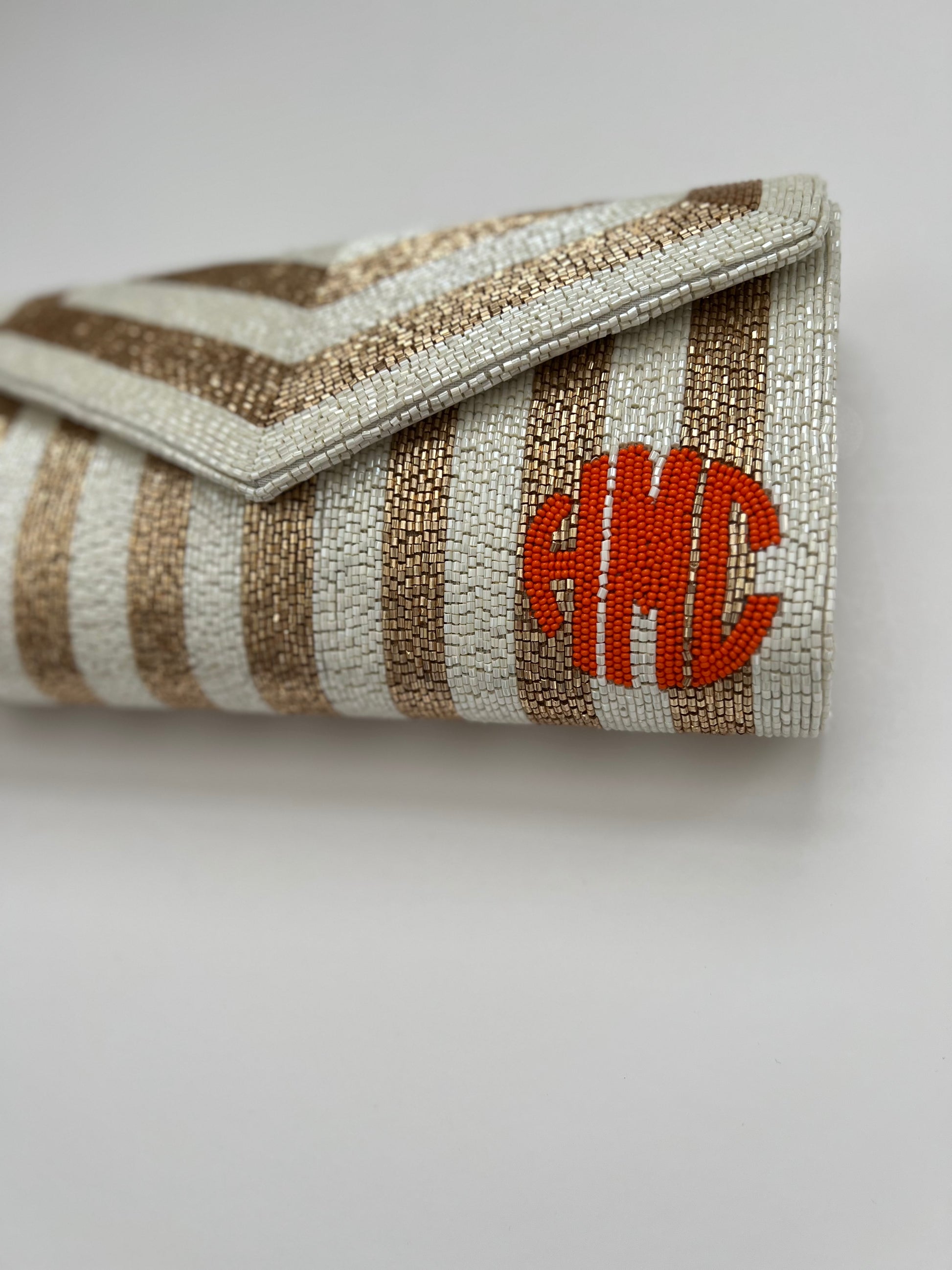 goldish bronze and white striped clutch with bright orange beaded monogram on the bottom left. Must have 3 initials.