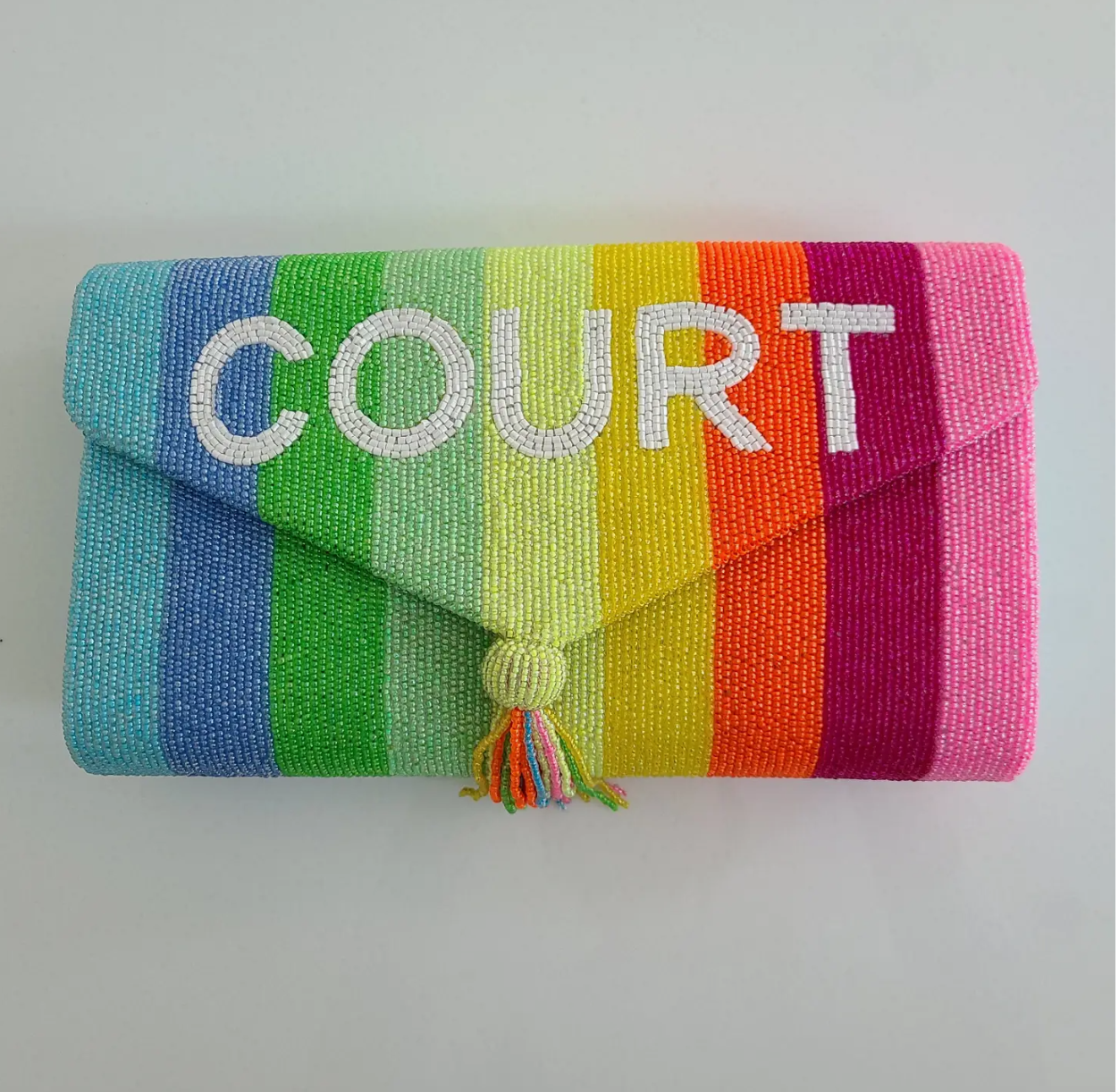 rainbow striped clutch with white beaded monogram or name on the center front.