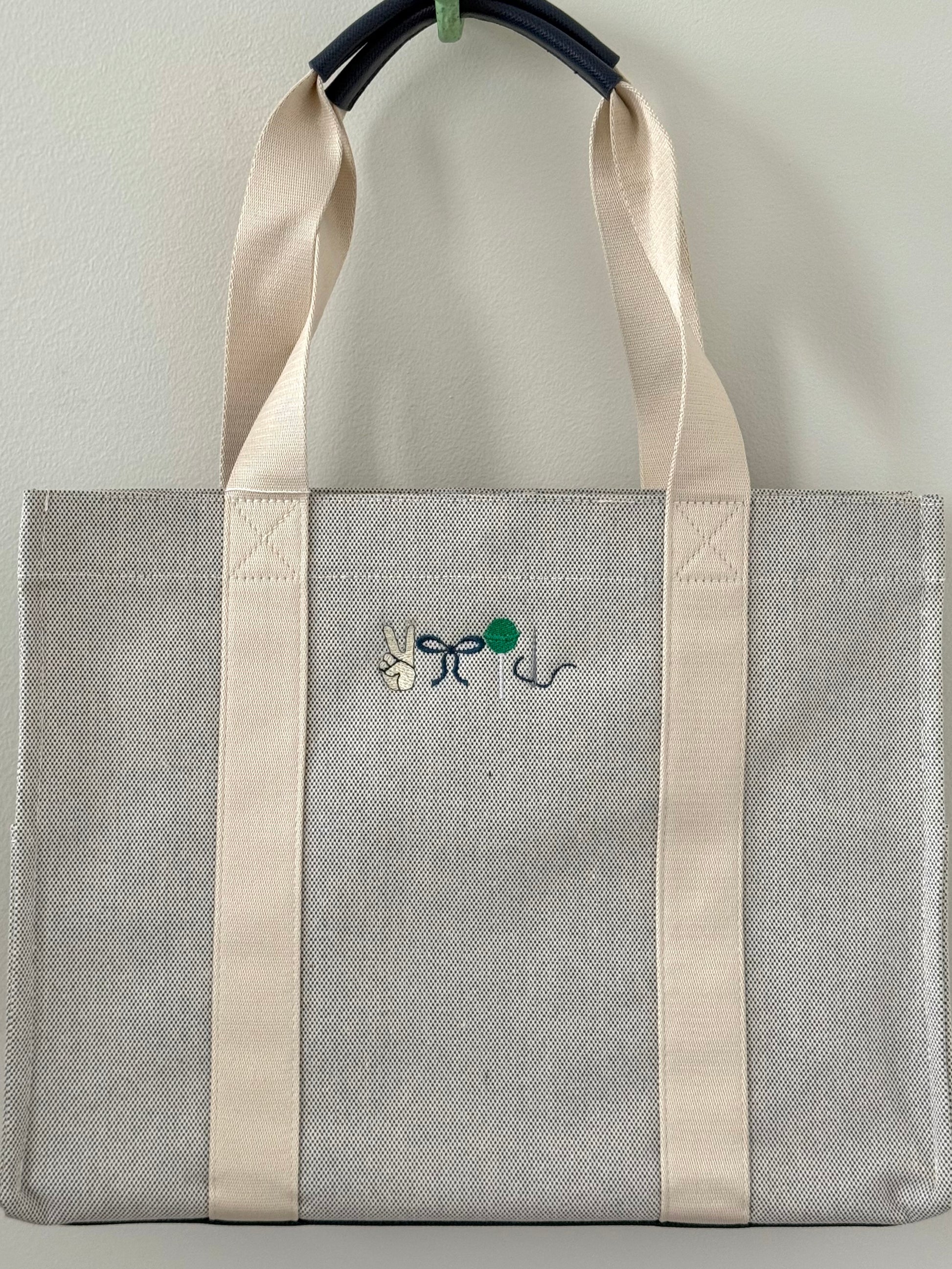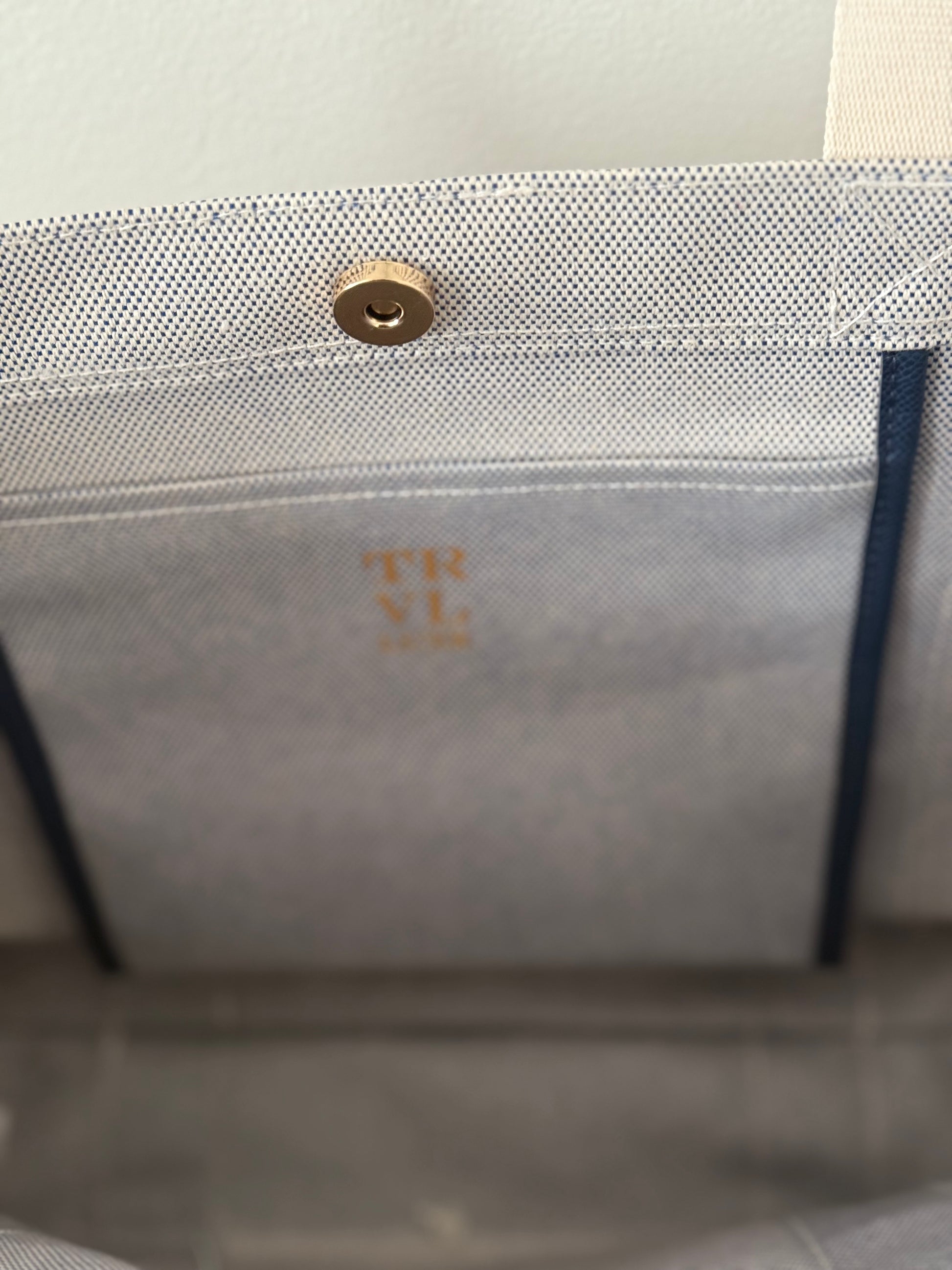 made in a Linen-poly blend and on the back coated in TRVL Design's signature matte enviro clear. This beautiful and chic material is stunning paired with a monogram. Our roomy tote can easily hold your laptop, lunch and daily essentials like makeup, a wallet, sunscreen and also has side pockets for your phone. The interior is wipeable and the bags are machine washable - spot clean, cold, gentle and line dry!