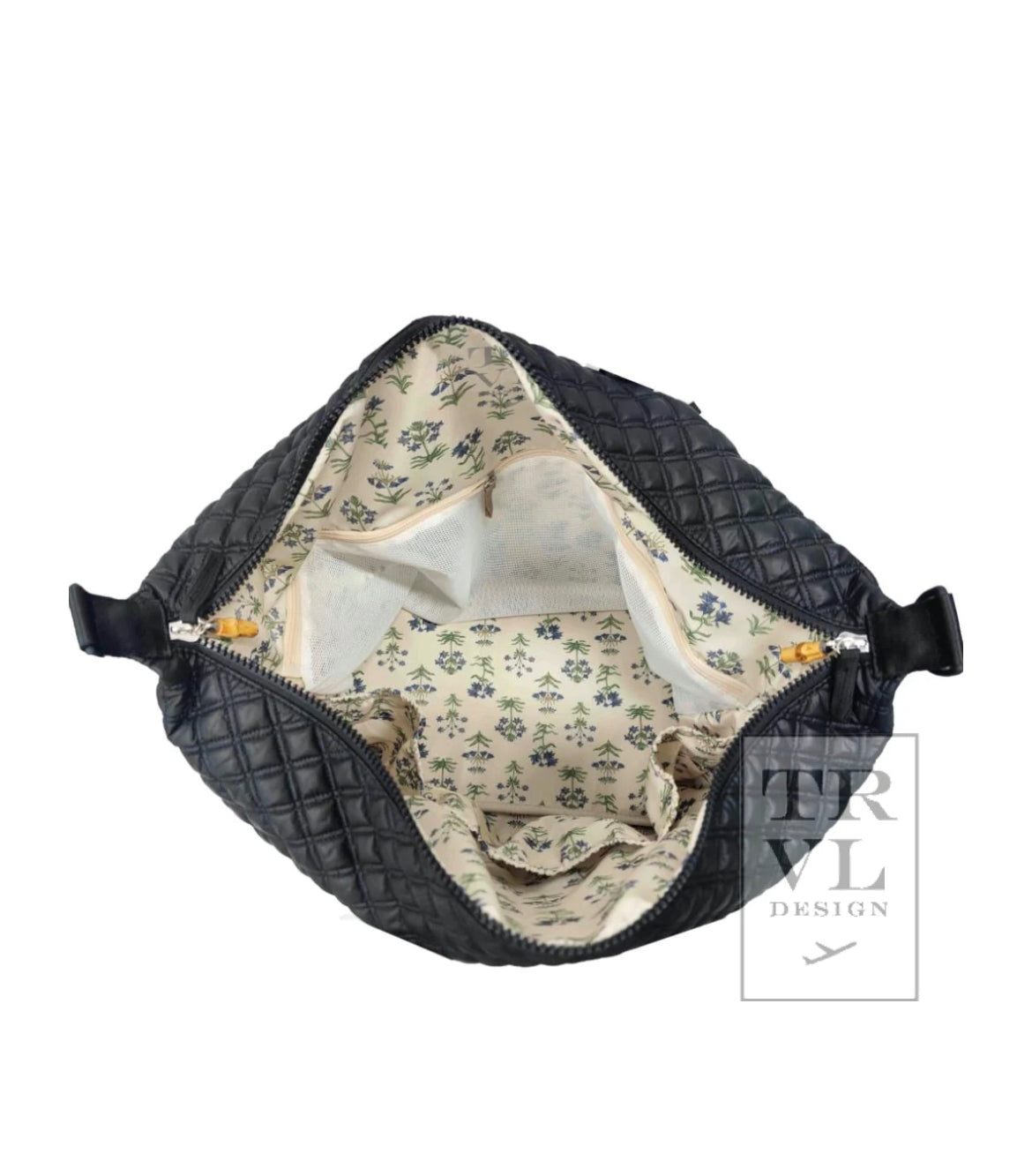 The black bag is lined in a beautiful french floral print