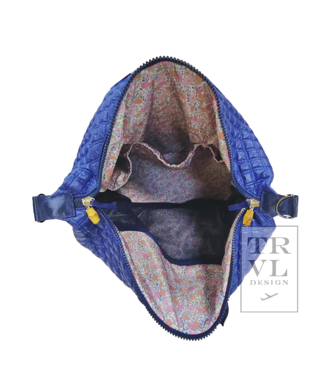 The navy bag is lined in a colorful garden floral print
