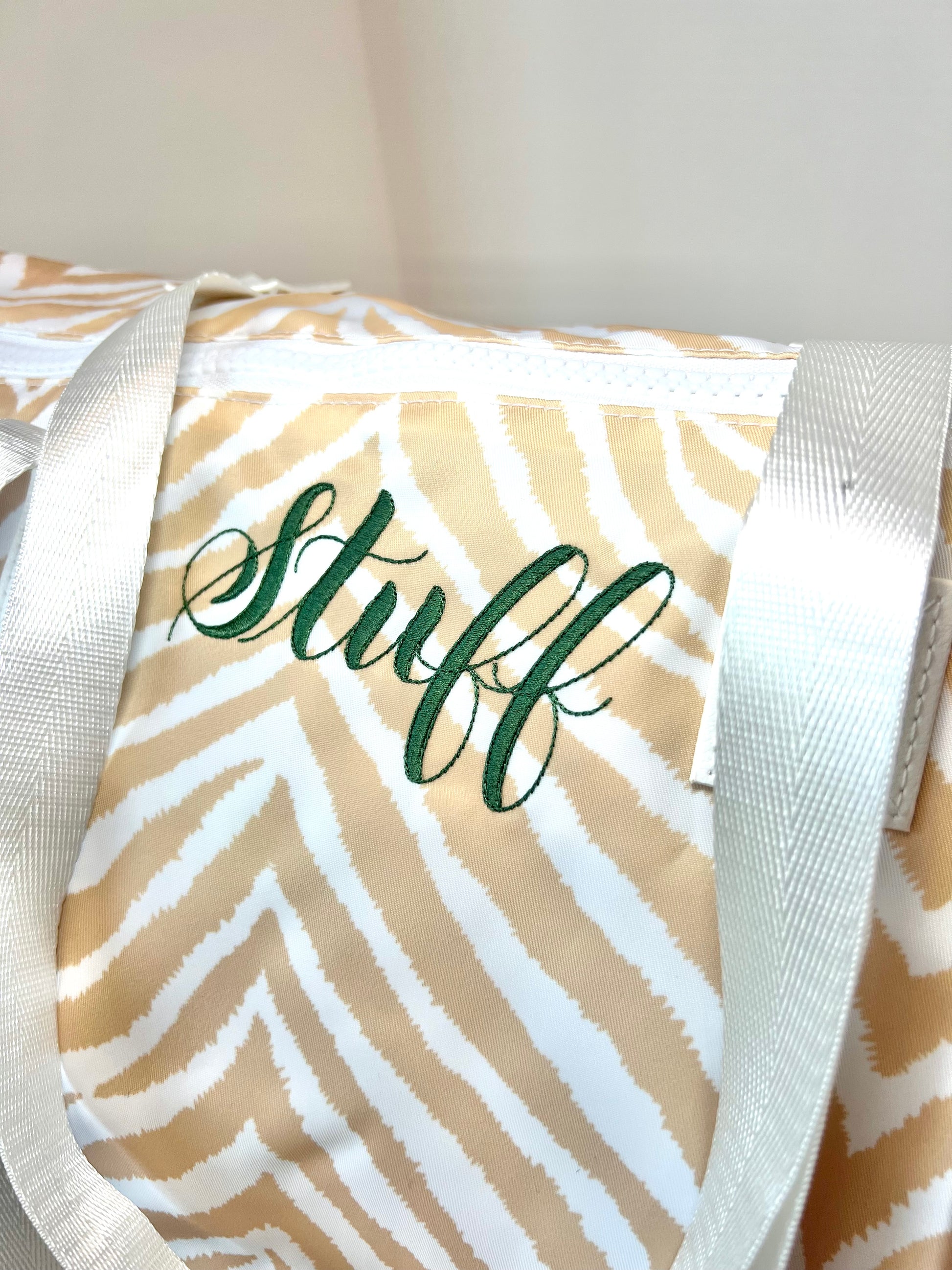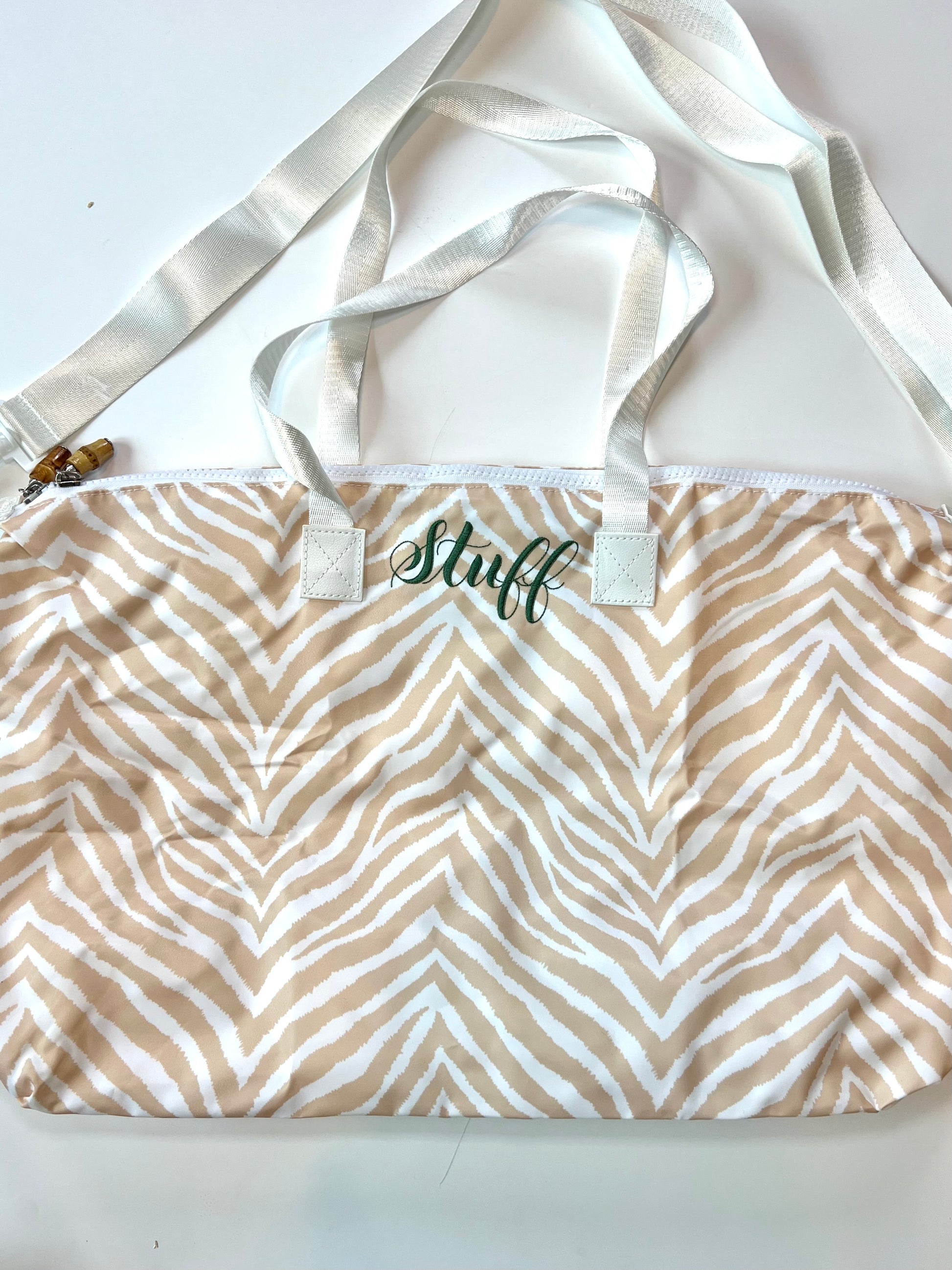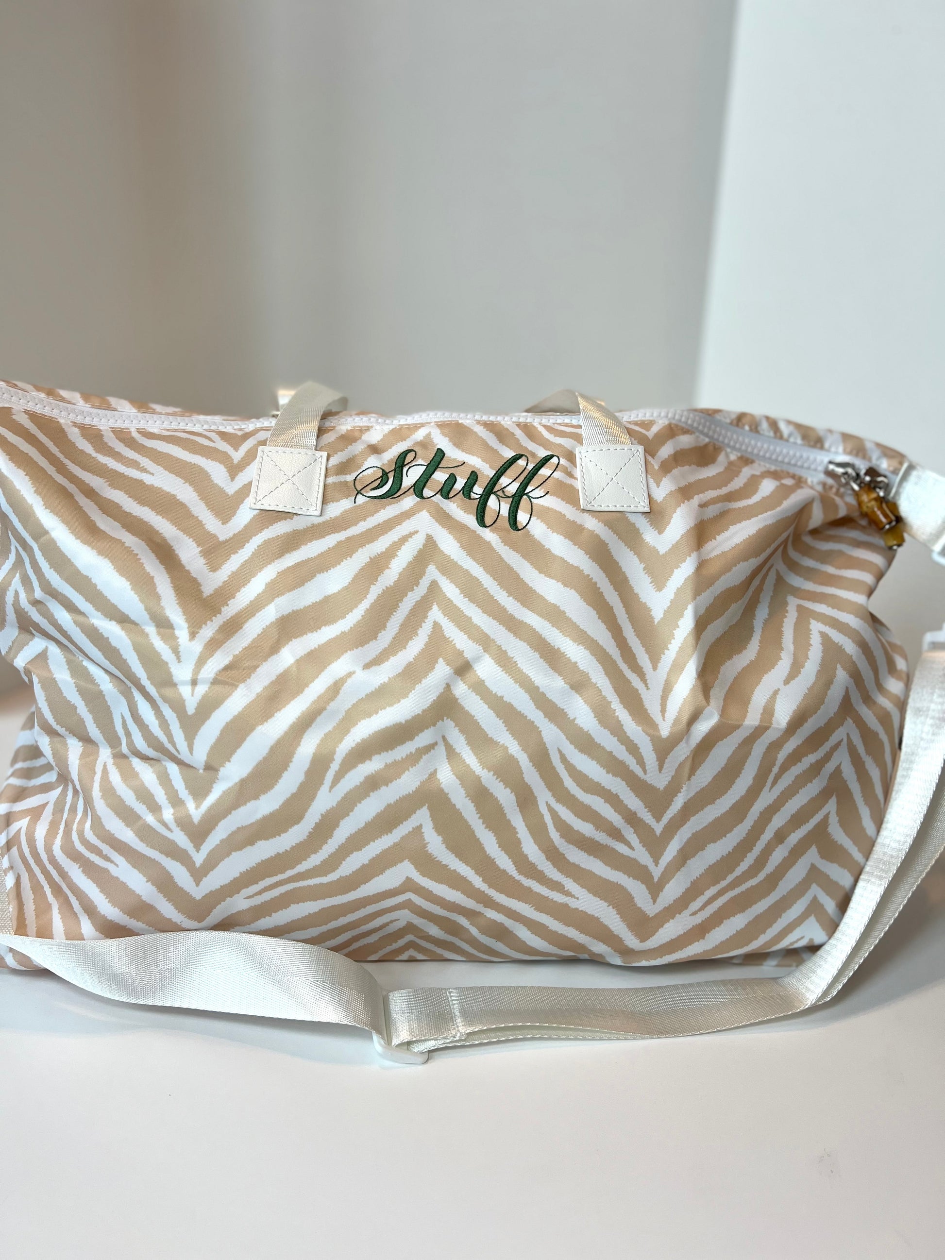 Neutral with a twist! This duffle is the perfect "fold and store" travel item. It is light weight, folds in to a neat little square (a bag is INCLUDED to store your duffle nice and neatly) and also expandable. The PACK IT UP features durable satin web handles, a detachable shoulder strap, and an outer trolley slide. This bag is compact when folded into its own mesh carry case which can double as an extra bag for wet clothing! Carry-on approved.