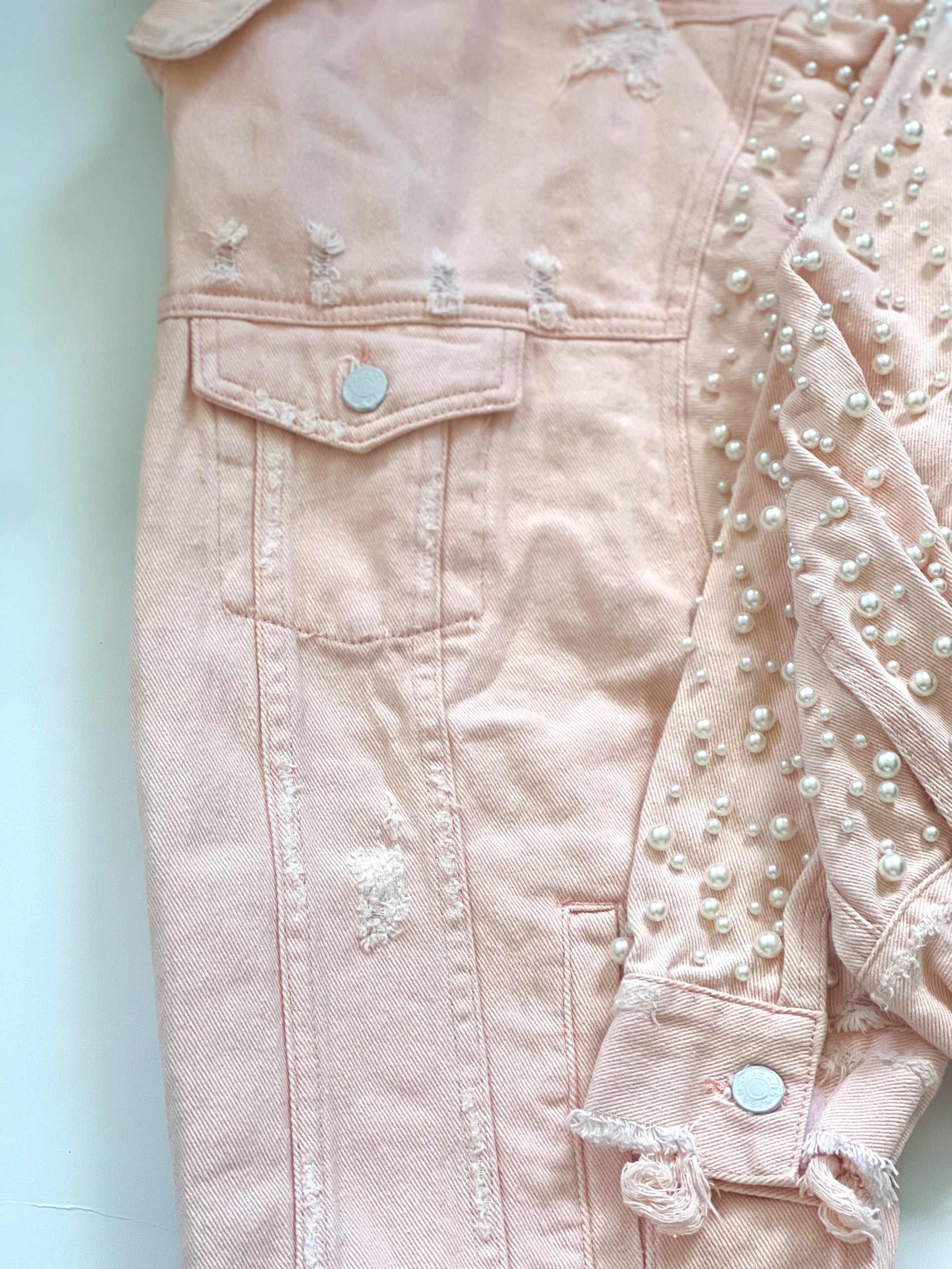 - Faded denim, contrast topstiching, banded/buttoned hem, distressed details, unlined