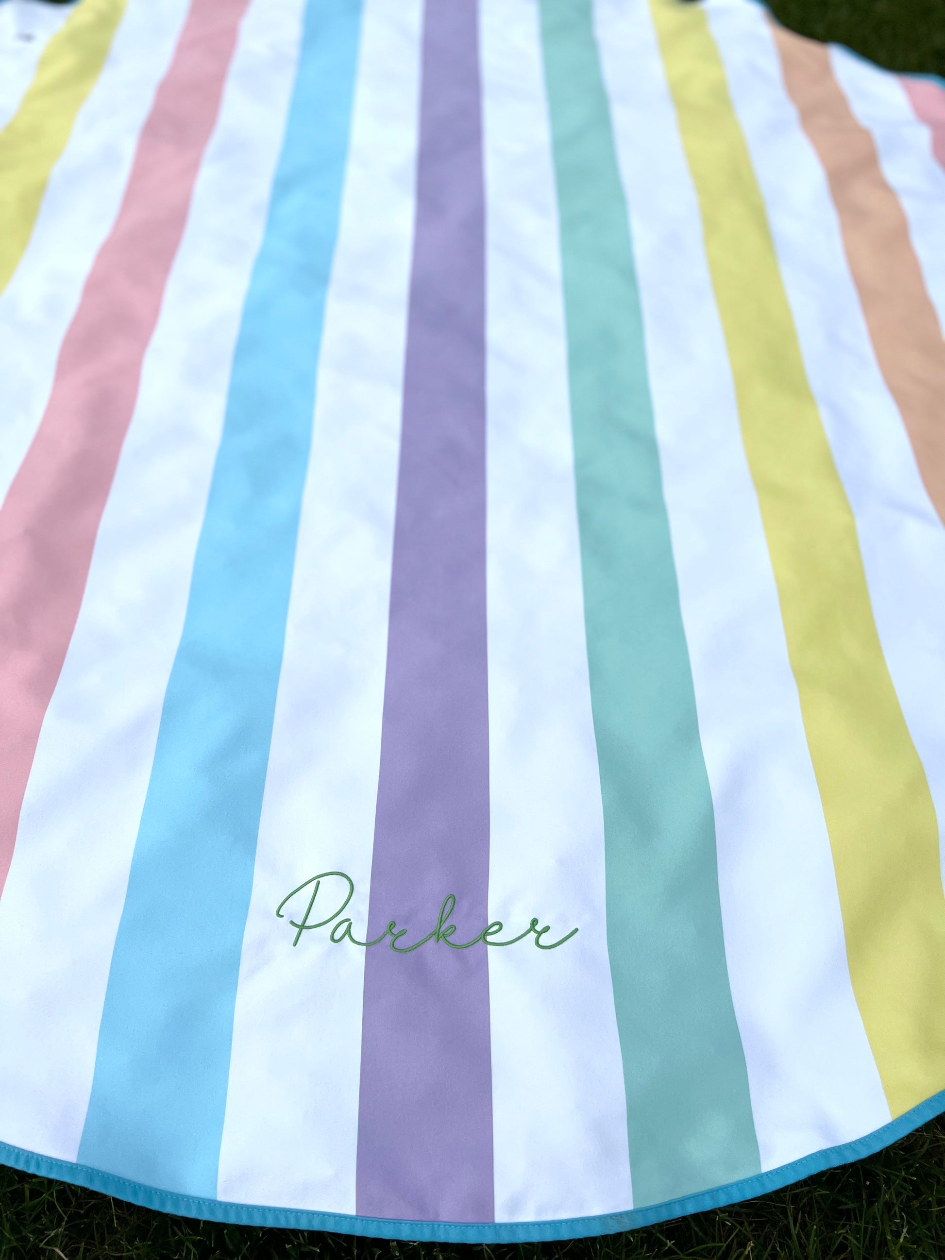 A summer staple at the beach, park, camping, lake, and sporting events. Quick dry and sand shakes right off. Huge size at 60" round, but packs down nicely for easy travel. Canvas bag included for easy storage.